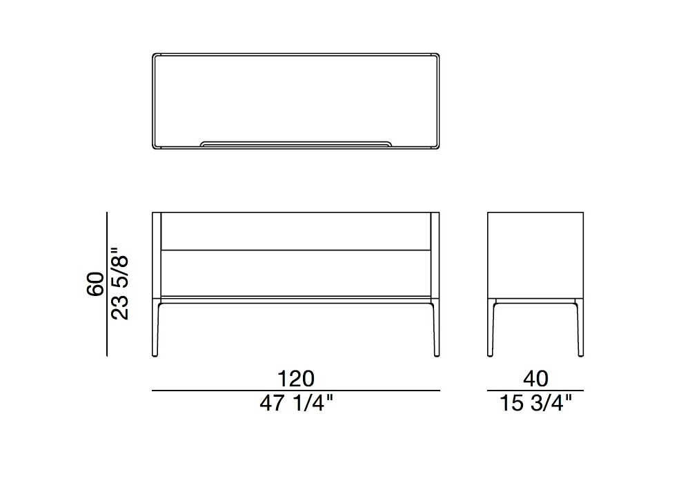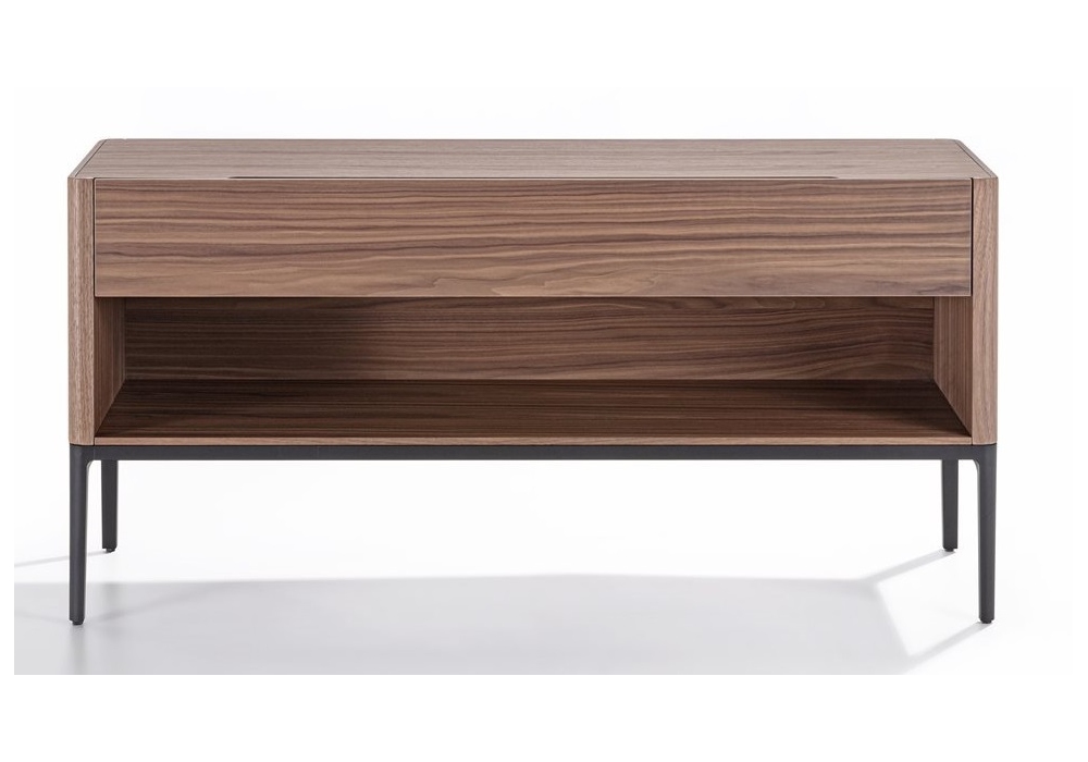 Nara 4 designed by D. Dolcini for Porada is a console for the back of sofa with drawer in canaletta walnut and structure in matt black painted aluminum.