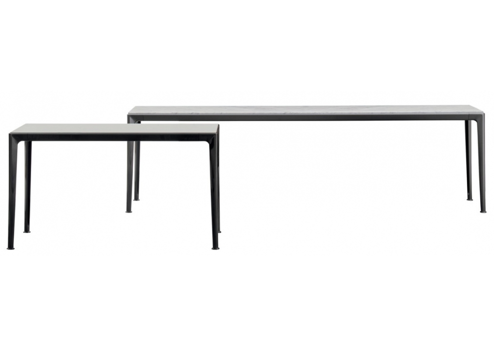 Mirto Indoor designed by Antonio Citterio for B&B Italia is a consoles collection with structure pewter painted or painted black chrome die-cast aluminium. Top available in glossy frisé eucalypt, oak veneered MDF wood fibre panel, glass or marble. Available in three dimensions.
