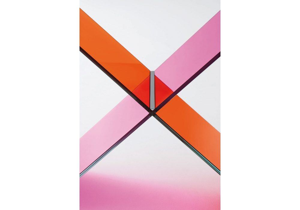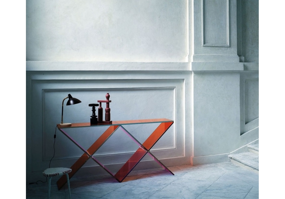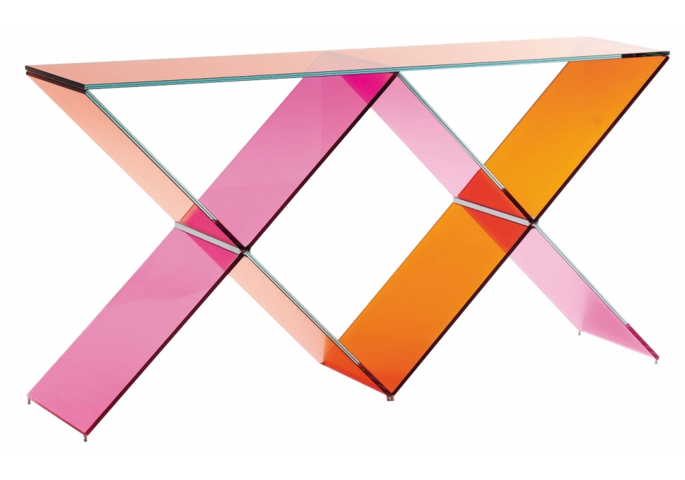 XX designed by Johanna Grawunder for Glas Italia is a console made of transparent pink and orange glass. The base made up of two Xs in tempered and stratified 8 + 8 mm. Glass, with special bevels and gluing, is embellished with elements in polished chromed metal. The top, in 8 + 8 mm stratified glass, rests on the base.