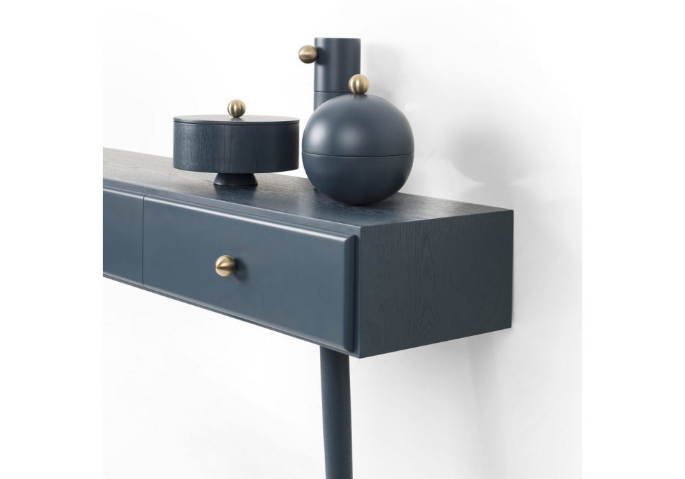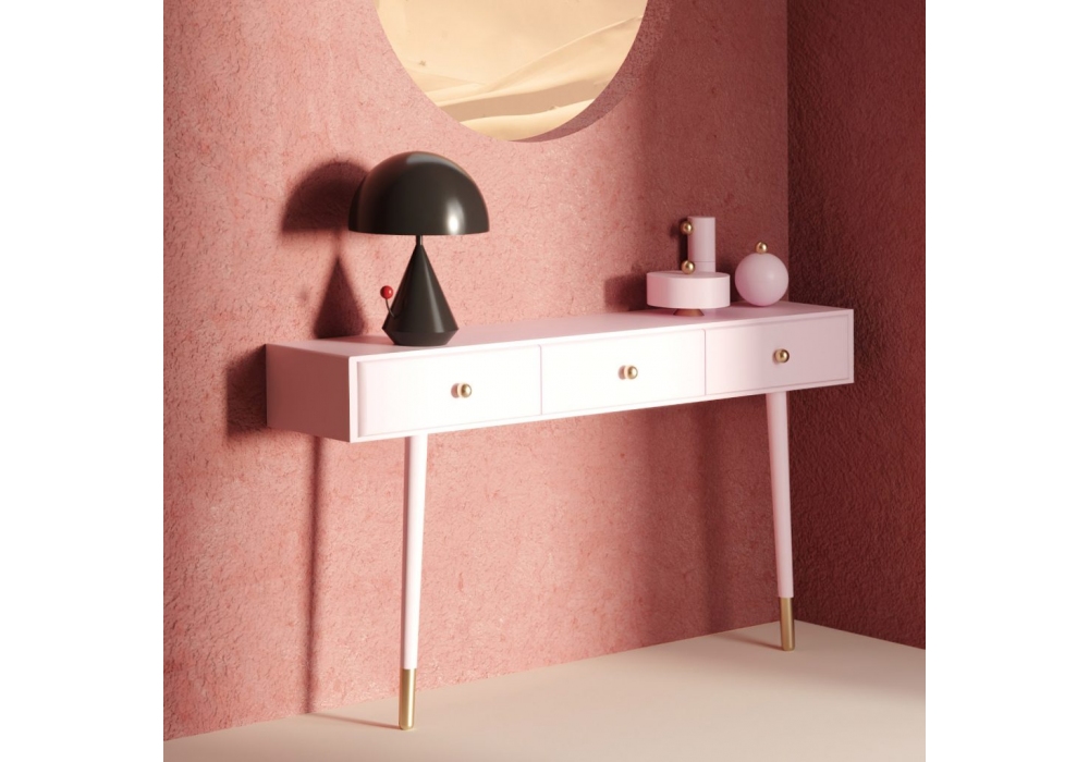 Selavy designed by Thomas Dariel for Maison Dada is a console with a quadrangular shaped top structured in MDF with ash veneer painted in different finishes. Legs in ash veneered metal painted in different colors with metal tips. All the metal parts are calmed in shiny champagne. Selavy is available in two different sizes.