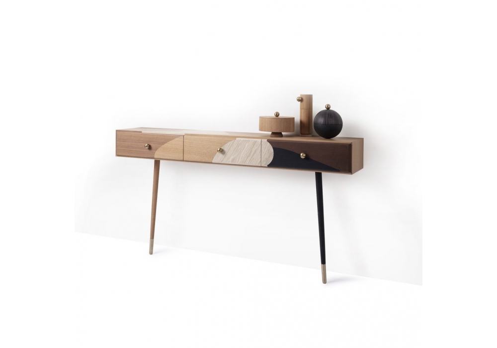 Selavy Marquetry designed by Thomas Dariel for Maison Dada is a console with a quadrangular shaped top structured in MDF with veneer and inlaid in ash. Black powder coated metal legs with metal tips. All the metal parts are calmed in shiny champagne.
