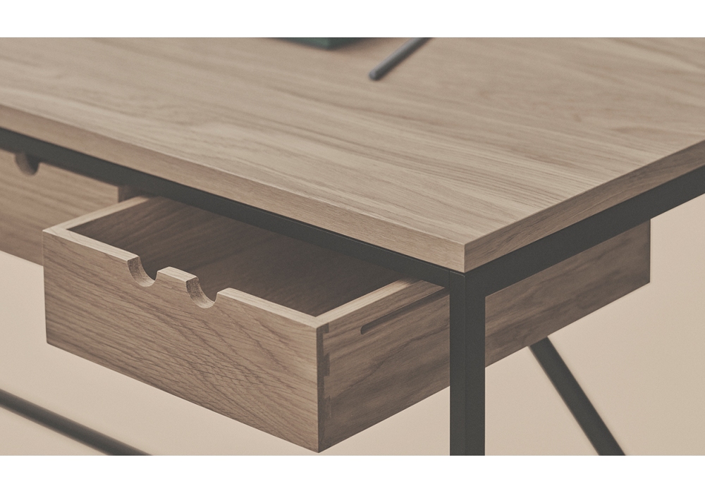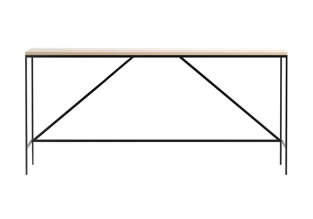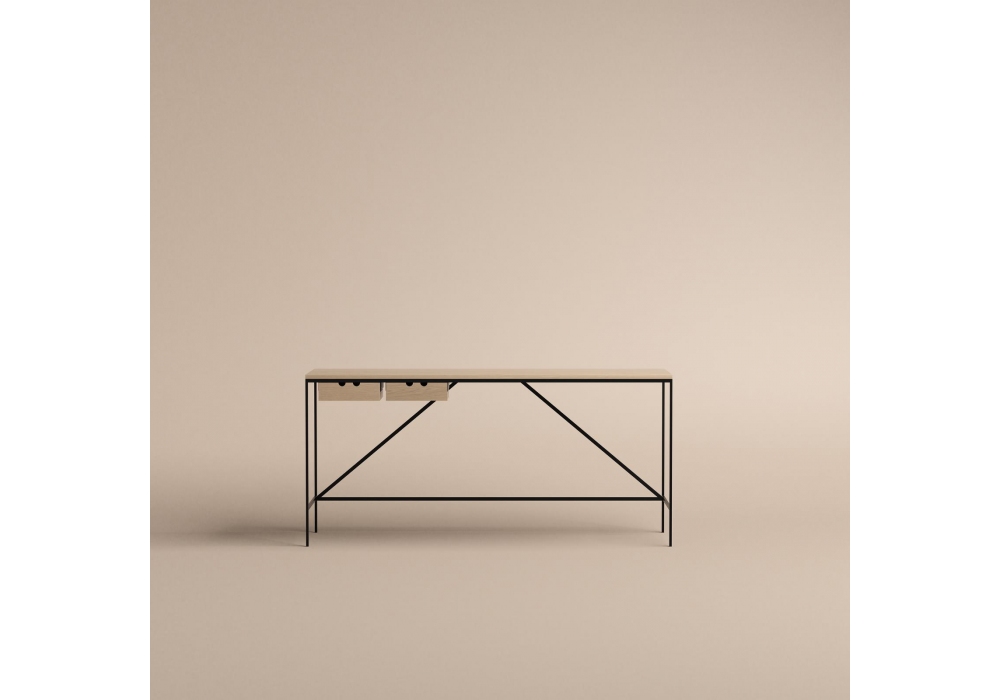 Cache Console designed by Paul McCobb for Karakter is a console made with powder coated steel structure and table top in oak veneer with clear lacquer. Optional set of two oak drawers.
