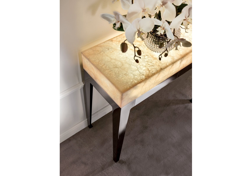 Gorky designed by Giuseppe Viganò for Longhi is a console with two front drawers, with structure in laser-cut ground metal and top in onyx or marble backlit with dimmable LED strip light, switched on by touch switch. Available in different dimensions.
