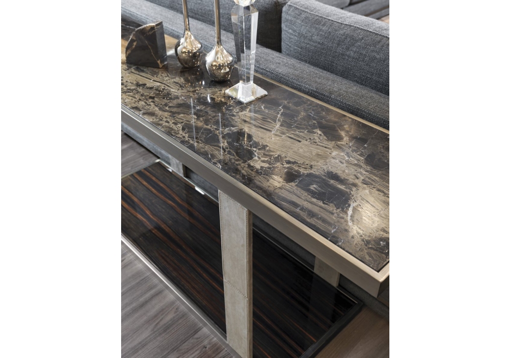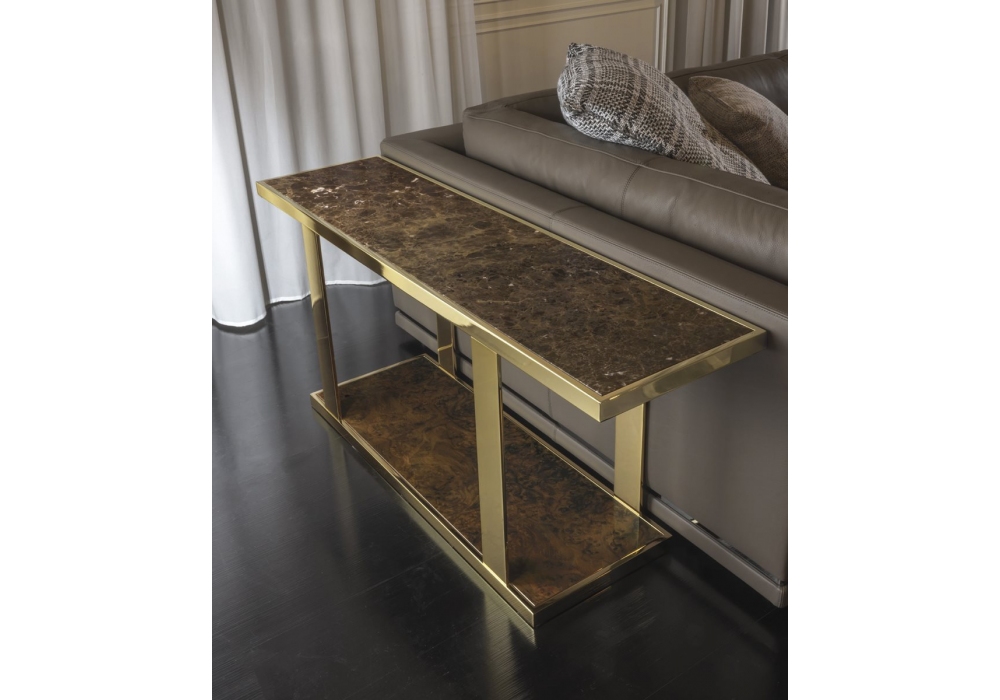 Layer designed by Giuseppe ViganĂ² for Longhi is a console with metal structure and marble top. Lower top in wood or covered in leather with columns in leather or on request in the same color as the structure.