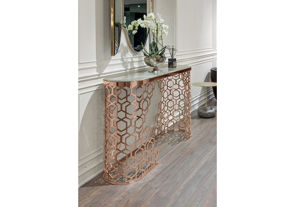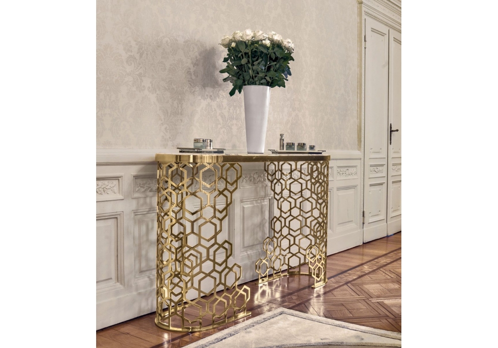 Manfred designed by Giuseppe Iasparra for Longhi is a console with top in marble, mirror or crystal and structure made of laser cut ground metal with Sequence decoration. Available in different dimensions.