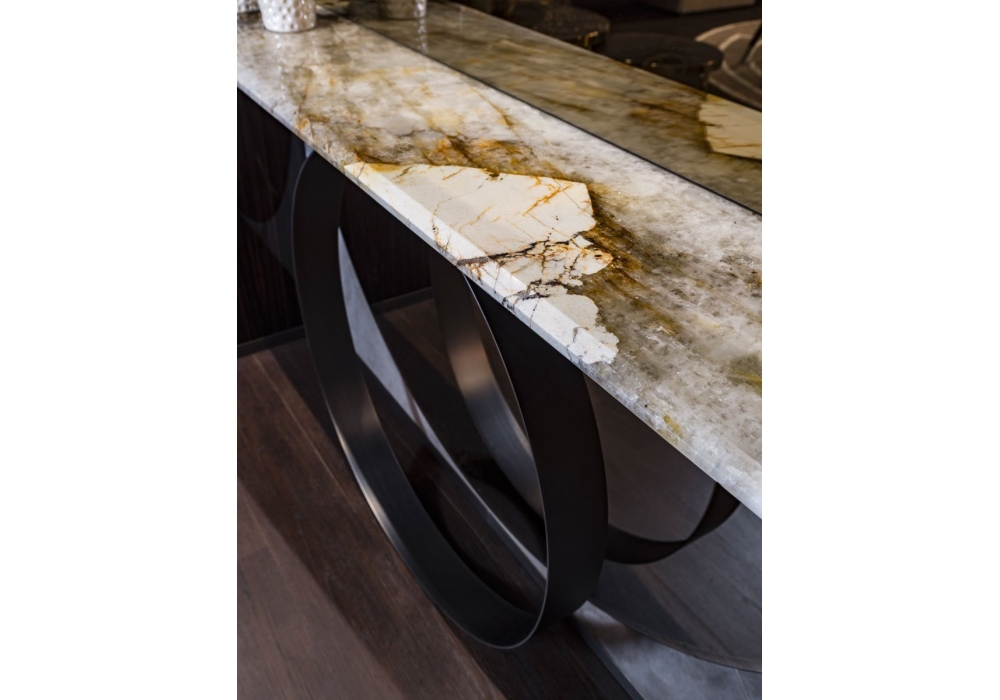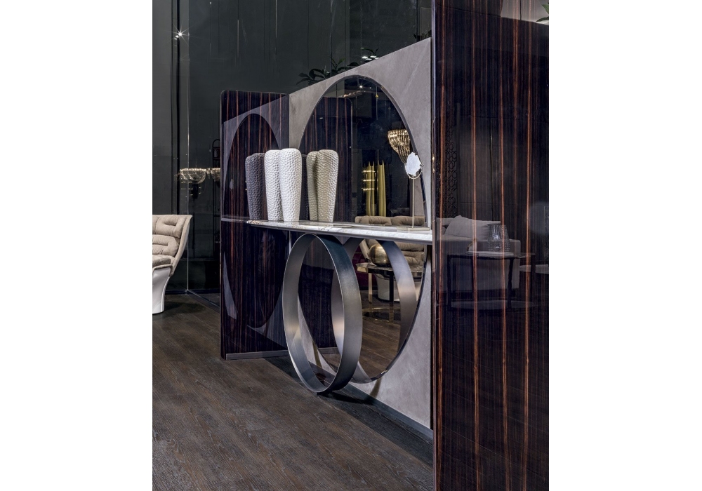 Note designed by Ben Wu for Longhi is a console with wooden structure, internal covering in leather with round mirror in different finishes. The top is in marble or mirror and rests on a ground metal ring. Available in different dimensions.