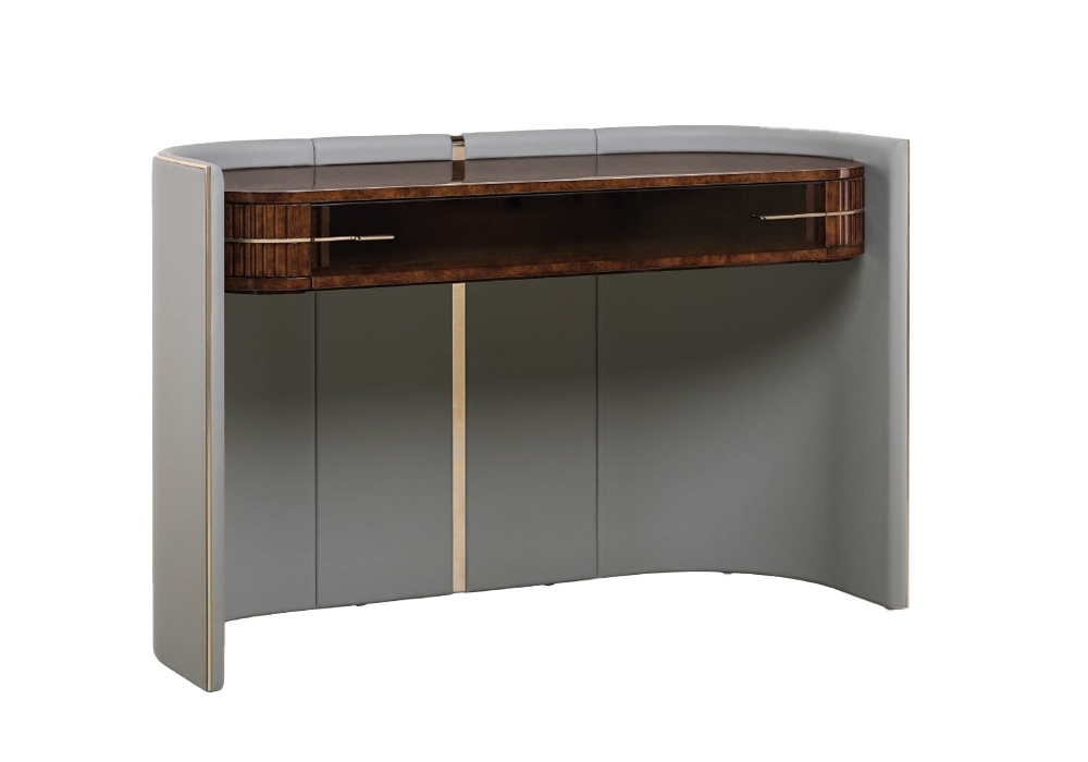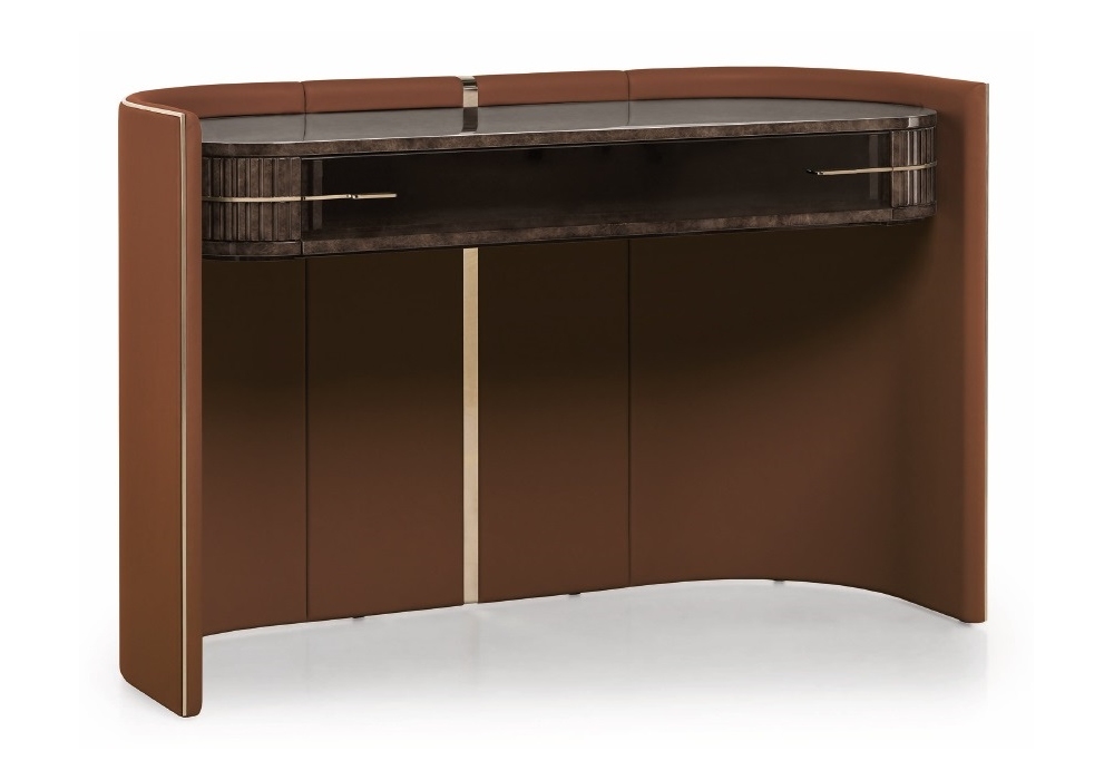 Eclipse designed by Andrea Bonini for Turri is a console made of MDF, plywood and particle board panels with hand-decorated glossy polyester finish. Structure upholstery in different leathers. There is a wooden drawer with decorative pilasters and bronzed glass, and an internal one with a hand-decorated glossy polyester finish.