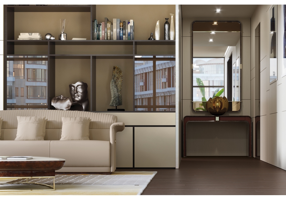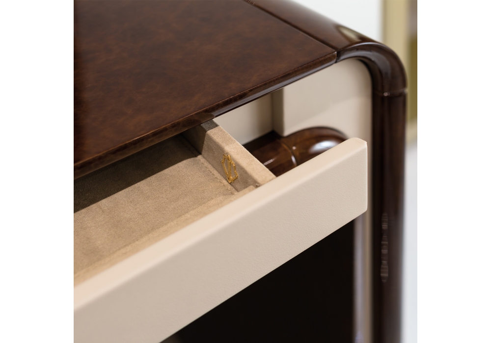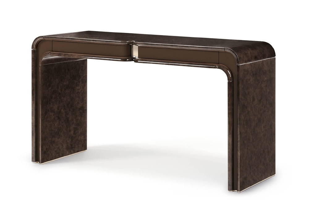 Madison designed by Andrea Bonini for Turri is a console with structure in MDF and particle board panels in hand-decorated glossy polyester finish with leather inserts and golden metal details. There are two drawers with microfibre lining and leather applications.