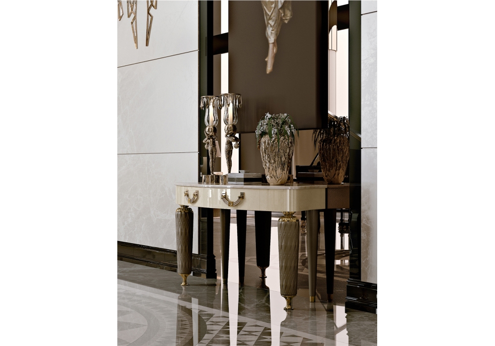 Numero Tre designed by Roberto Serio for Turri is a console with structure in MDF, solid wood, plywood and chipboard panels in glossy finish and top in wood or marble. There are two drawers with internal lining in microfiber. Available in the version with gold metal handles or with leather applications.