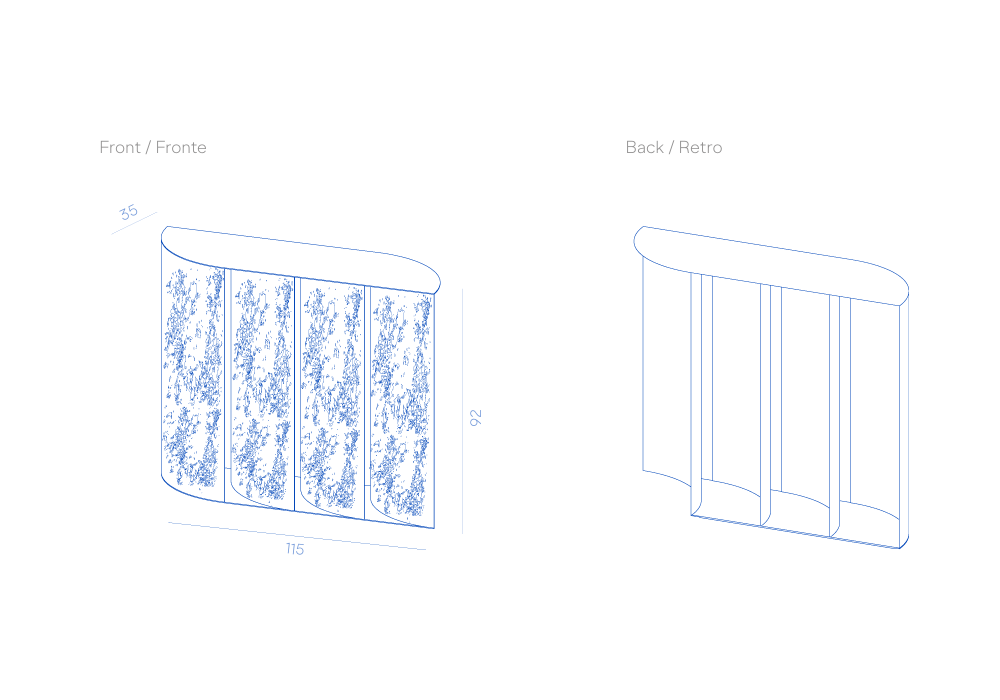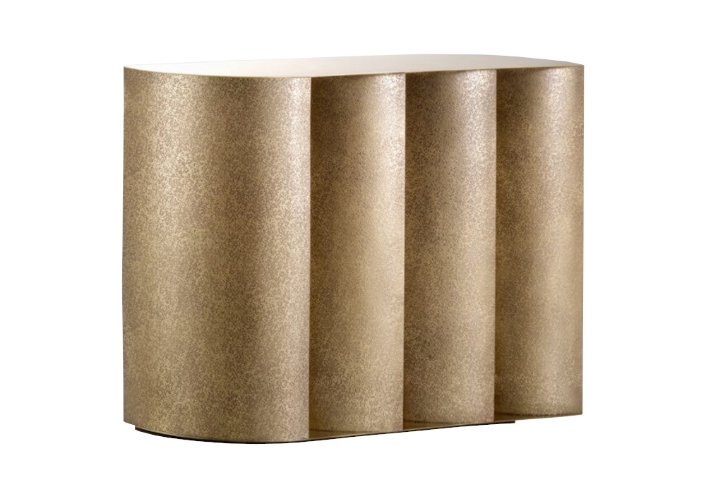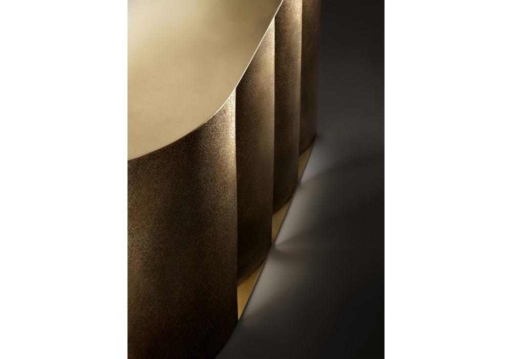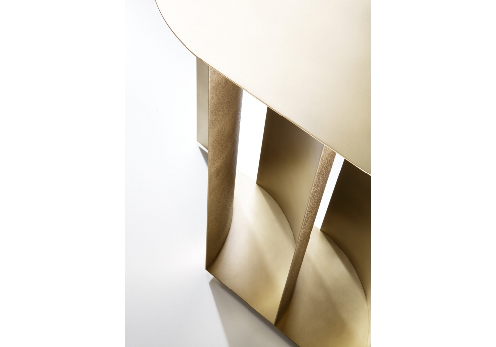 Sinestesia designed by TipStudio for DeCastelli is a console made entirely of brass, composed of a base of 4 curved plates and a top with rounded ends.