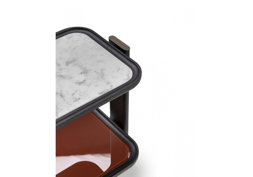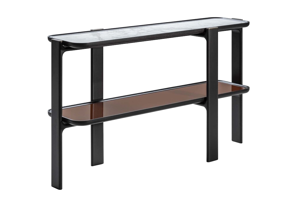 Duo Console designed by Roberto Lazzeroni for Poltrona Frau & Ceccotti Collezioni is composed of structure and frames in solid ash, shelves in the same finish chosen for the structure or in colored glass or in semi-gloss Calacatta marble.