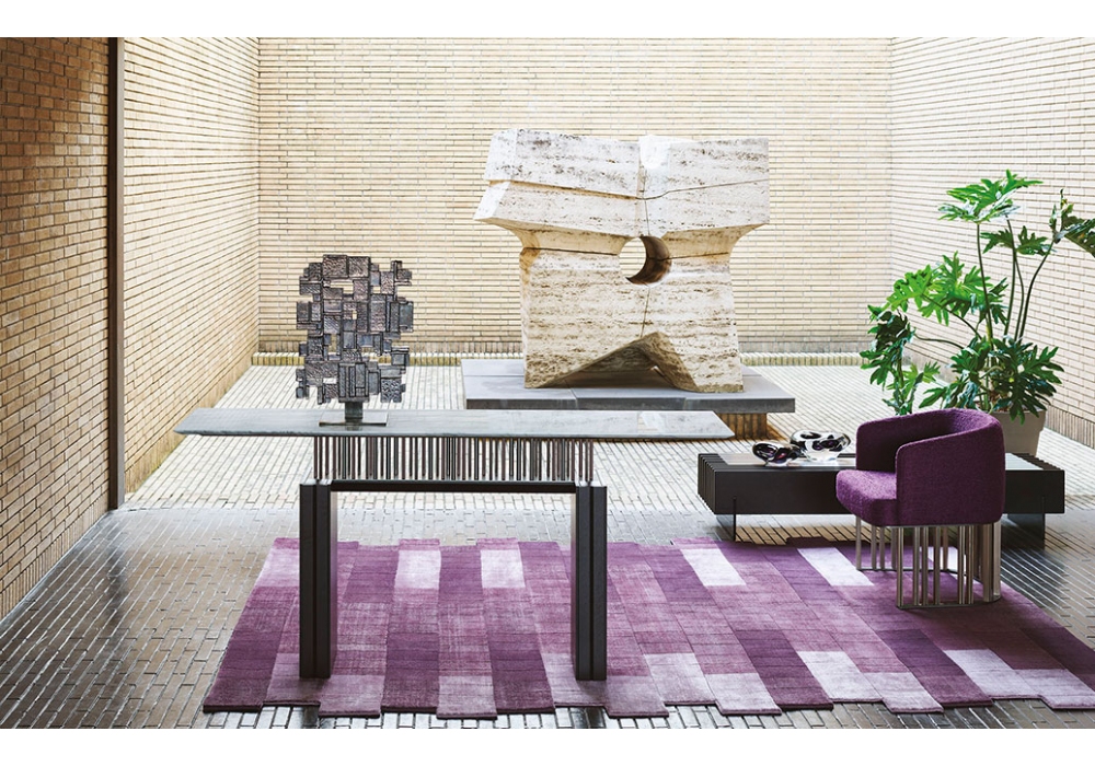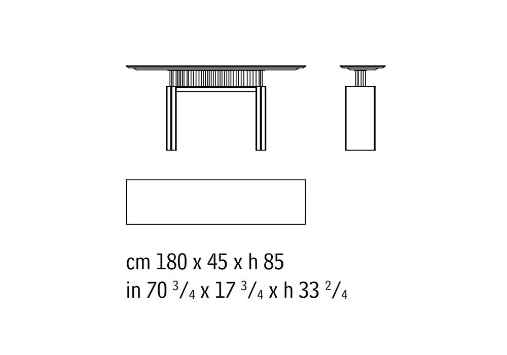 G-Code designed by Dante O. Benini and Luca Gonzo for Giorgetti is a console with structure in Canaletto walnut, in various finishes. The top has 30° bevelled edges and can be made of marble or Canaletto walnut, in different colours, and is joined to a titanium lacquered MDF under-top, both supported by a metal structure characterized by 49 cylinders of three different sizes and finishes (brushed champagne, matte bronze, pewter). Adjustable feet with hidden mechanism.