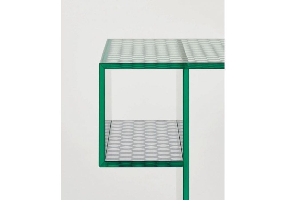 Robotin designed by Patricia Urquiola for Glas Italia is a console made of a special mirrored crystal on both sides, with a decorative pattern of transparent stamps, which simulates a perforated sheet metal. All crystals are tempered and UV glued.