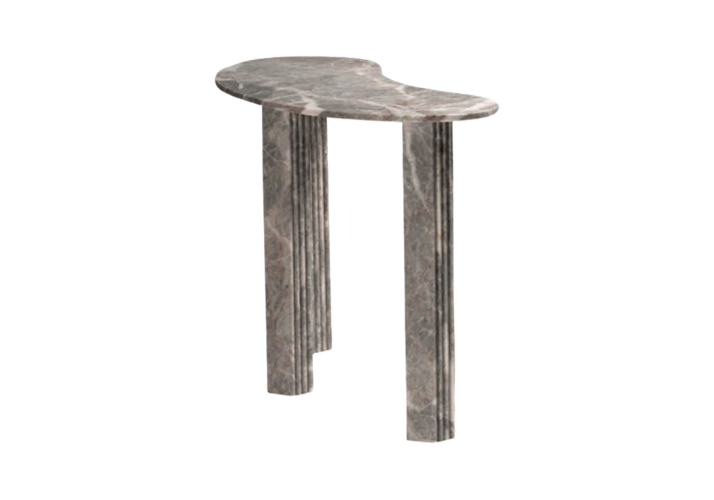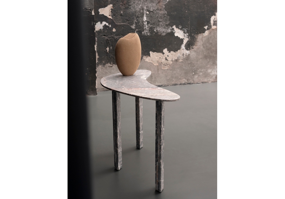 1953 designed by Lorenzo Bini for Tacchini is a console in opaque peach blossom marble, with three legs created through the juxtaposition of four slightly offset strips of the same marble.