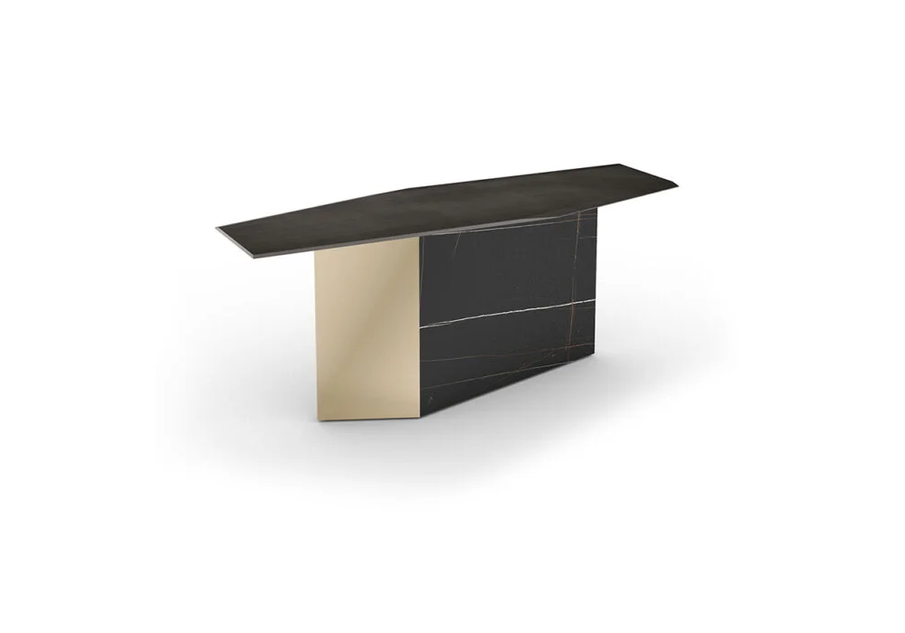 Cubitum designed by Riccardo Lucatello for Reflex Angelo is a console made with a wooden base with Bronze finish edges. Interior: long side in bronze mirror, short side in Marmoreflex. Exterior: short side in bronze mirror, long side in Marmoreflex.