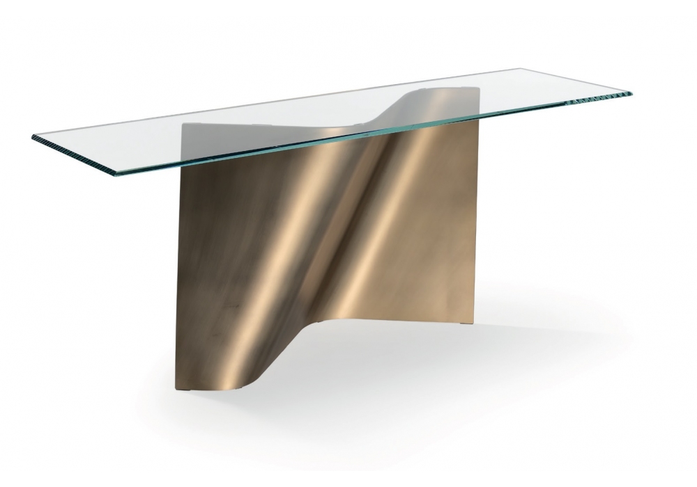 Esse designed by Tulczinsky for Reflex Angelo is a console with a curved extra-clear glass base in Bronze, Brass, Dark Brass and Titanium finishes. Rectangular top in transparent or extra-clear glass.
