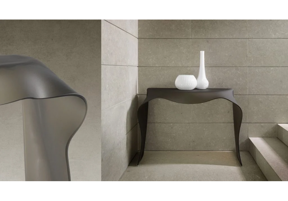 Foulard designed by Reflex Angelo is a console in extra-clear curved glass, bronze or smoked with an acid-etched external finish. Also available with an external finish in satin brass or dark brass or glossy lacquered in the colors Venezia.
