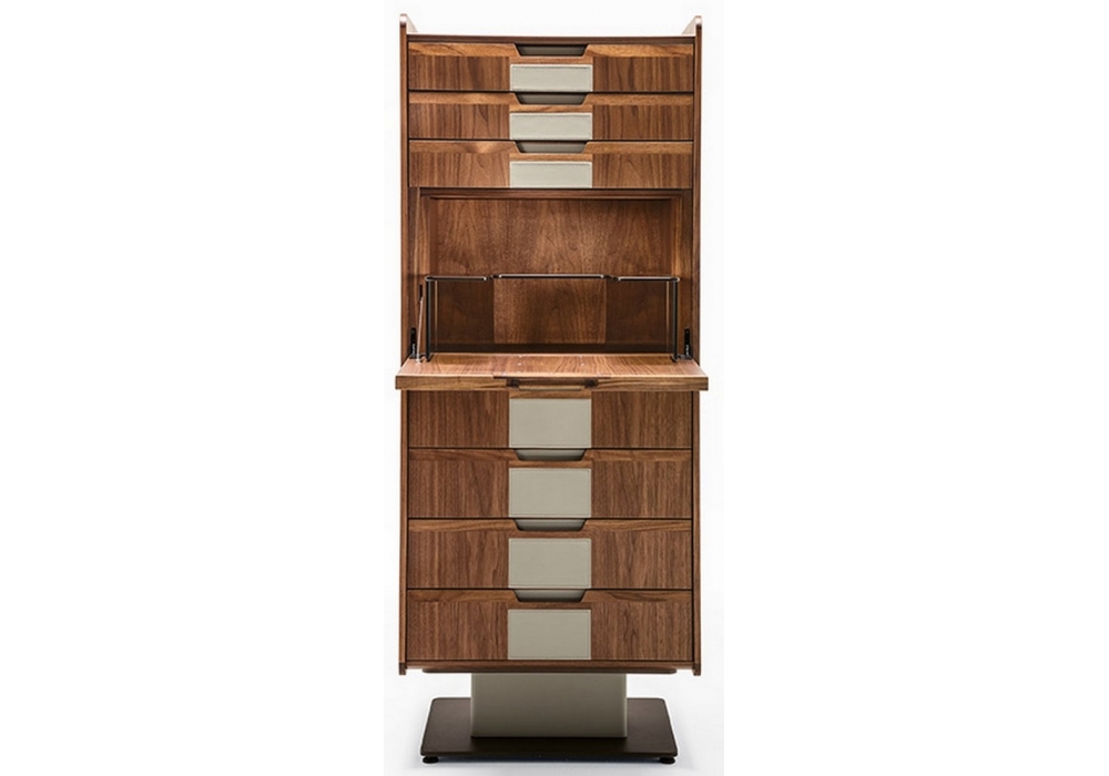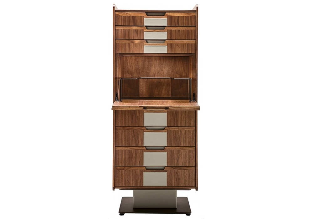 Corium designed by Umberto Asnago for Giorgetti is a chest of drawers with structure in poplar plywood, veneer and solid canaletto walnut, in different finishes. The base is in bronze painted metal, with column and drawer fronts covered in saddle leather. The chest of drawers is equipped with 7 drawers with fully extractable, retractable sliding guides, and a flap door with an internal shelf in bronzed glass.