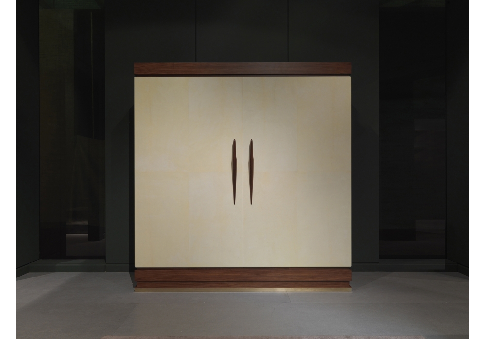 Gentleman designed by Guglielmo Ulrich for Ceccotti Collezioni is a wardrobe made in rosewood, internal in maple wood, handles in ebony and rosewood, internal drawer unit, metal parts in polished brass. Doors in parchment.