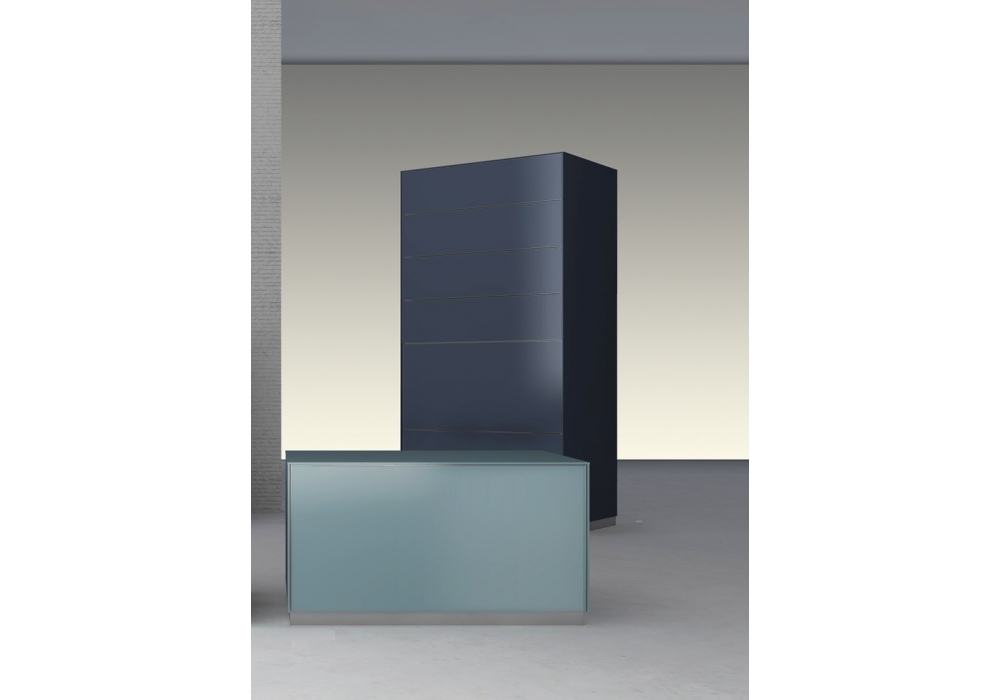 Self designed by Giuseppe Bavuso for Rimadesio is a modular system for each area of the house, which allows to create single and double-sided sideboards, tables, drawer units and suspended wall compositions. A project whose main quality is its versatility, combining the aesthetics of Rimadesio lacquered glass in all its variety of Ecolorsystem colours. Self can be freely designed, with modular horizontal compositions or vertical shaped cabinets. The system consists of set of drawers and flap doors, completely covered by lacquered glass, and wooden open modules lacquered in Ecolorsystem finishing. The compositions are freestanding with aluminium base and adjustable feet