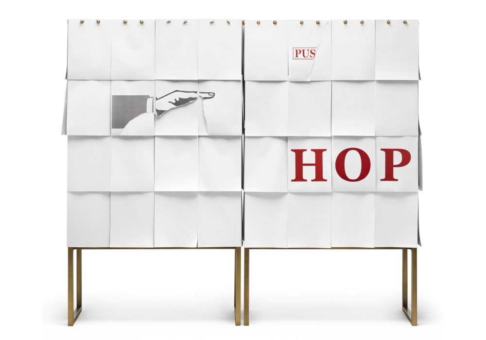 Notes designed by Claudio Bitetti for Mogg is a sideboard with front and sides covered with white sheets in A4 format, superimposed and interchangeable. Metal base. It is possible to apply any sheet / print / photo in UNI A4 format.