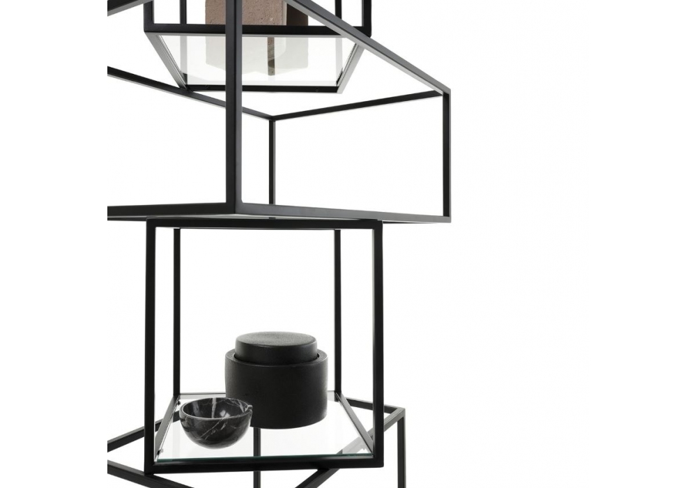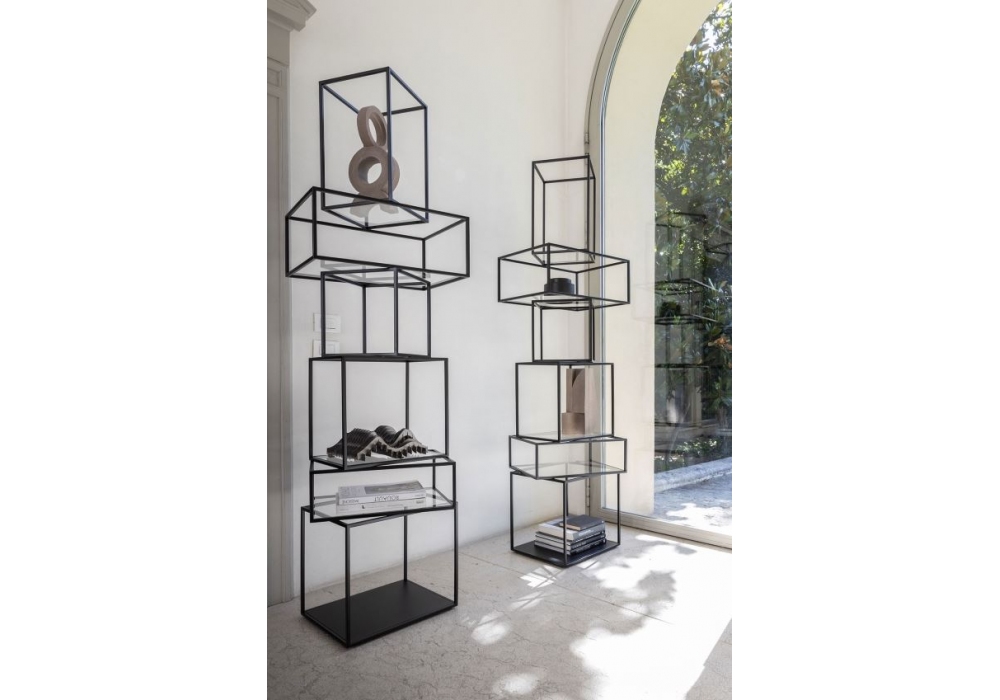 Babylon designed by Emanuele Magini for Mogg is a freestanding container in black painted metal, complete with transparent glass shelves.