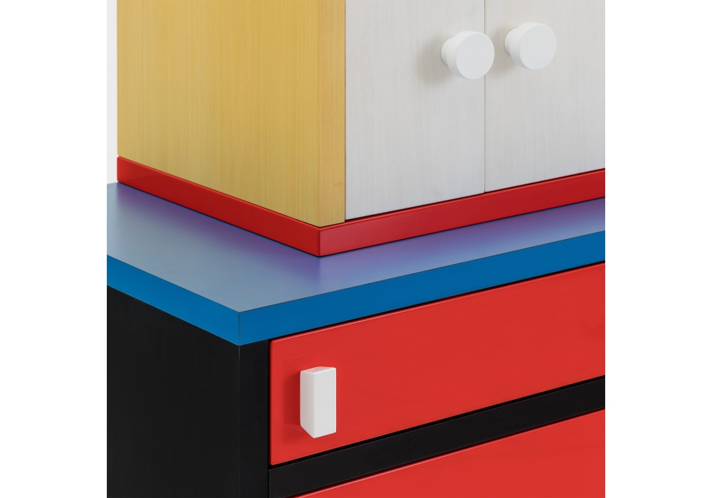 Granito designed by Nathalie Du Pasquier for Memphis Milano is a chest of drawers made with two cabinets, veneered wood, lacquered wood and plastic laminate. Limited edition of 25 pieces.
