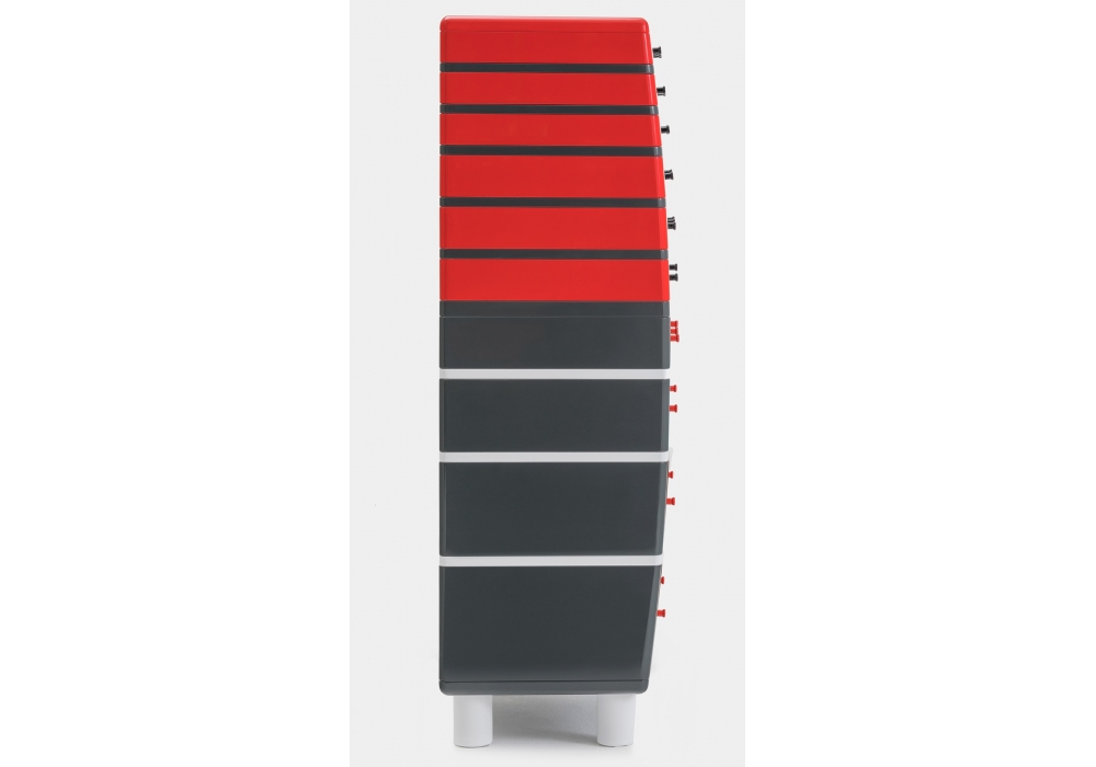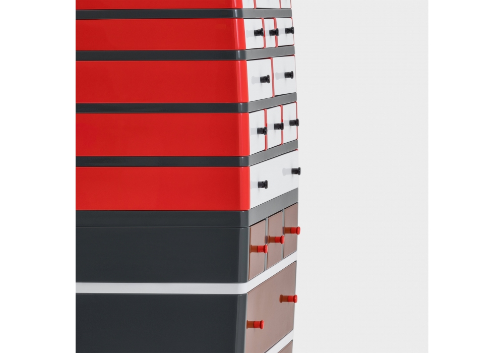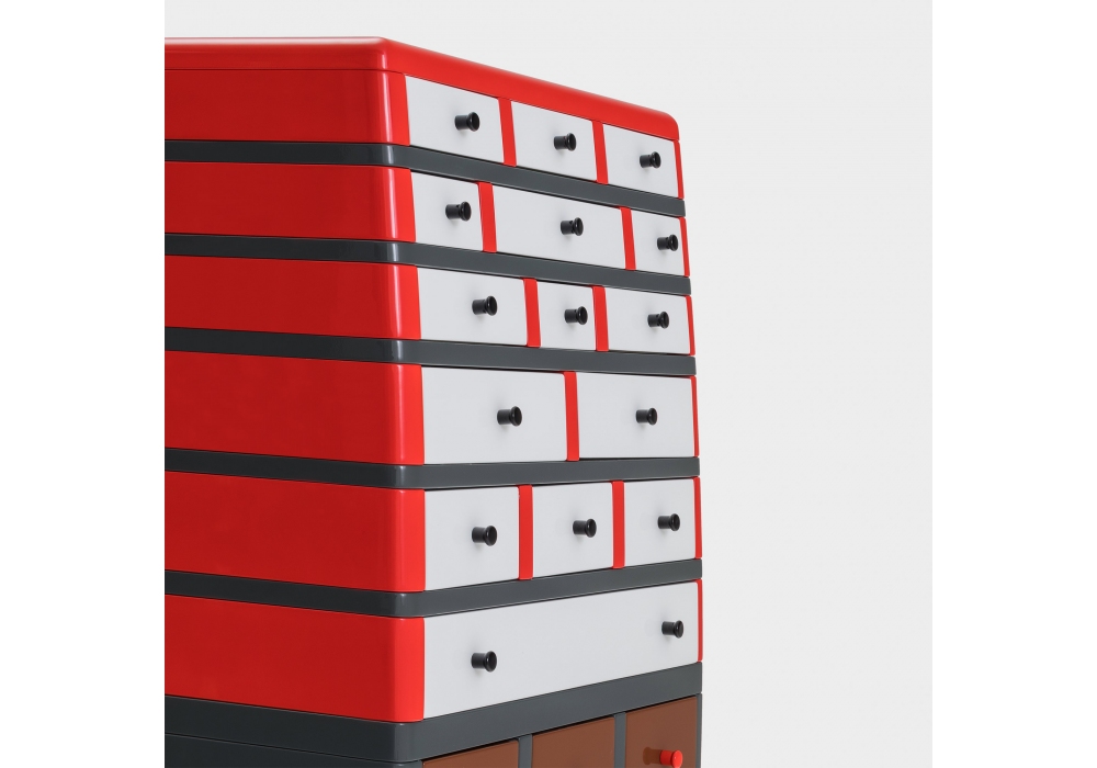 Tulipano designed by George J. Sowden for Memphis Milano is a chest of drawers made of lacquered wood, with 21 drawers. Limited edition of 25 pieces.