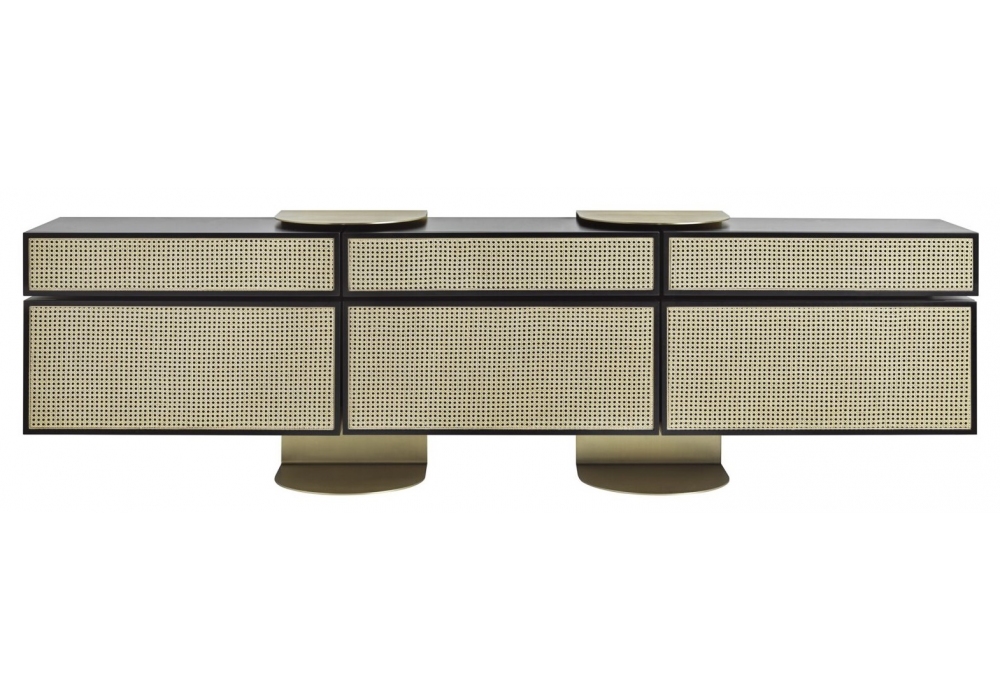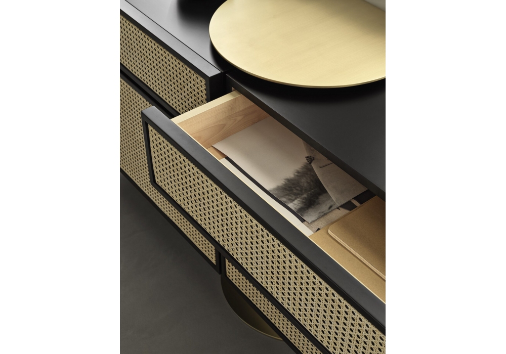 Nyny designed by Storage Milano for Gebrüder Thonet Vienna is a sideboard composed of six modules in lacquered wood, available in different finishes. Vienna straw decorative elements, metal structure with satin brass finish, to be fixed to the wall.