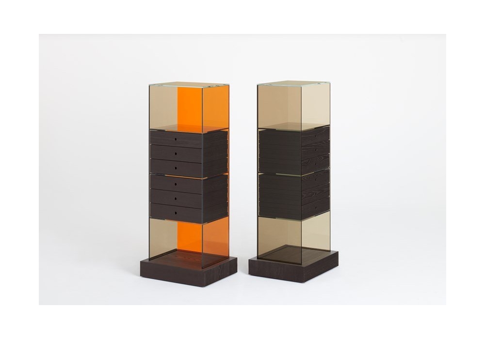 Mandarin designed by Piero Lissoni for Glas Italia with structure in stratified glass, colored transparent, glued to UV and a base and drawers in solid dark ash. Slats in extralight glass, glued to the sides of the furniture, act as “invisible” guides on which the drawers slide - left completely exposed - thanks to lowered grooves on the sides. Available in monochromatic glass or in the version with back in a different color. Under the base there are wheels, which allow for easy movement.