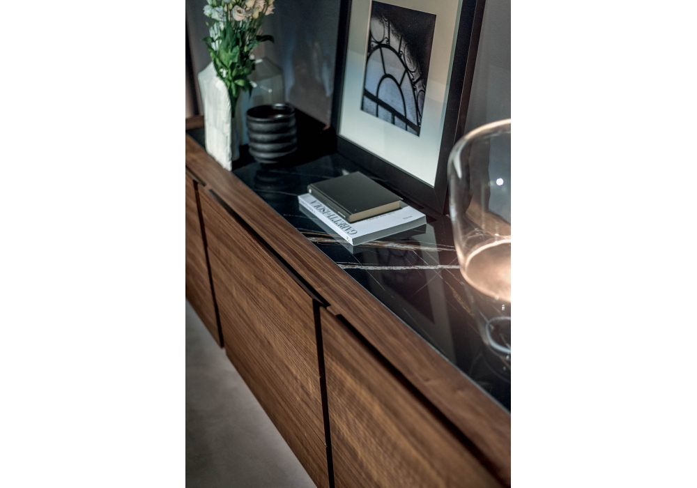 Pandora Up Small designed by Gabriele & Giuliano Cappelletti for Riva 1920 is a cabinet in blockboard with two side doors, also available in the version with insert on the top in metal, marble or glass. Restyling of the original version, involves the insertion of an iron base characterized by two sled legs. Doors equipped with small shelves to hold glasses. The central compartment houses a series of drawers assembled with dovetail joints. The side compartments are illuminated by means of LED strips positioned on the central shoulders, whose ignition is automatic through sensors that are activated when the doors are opened.