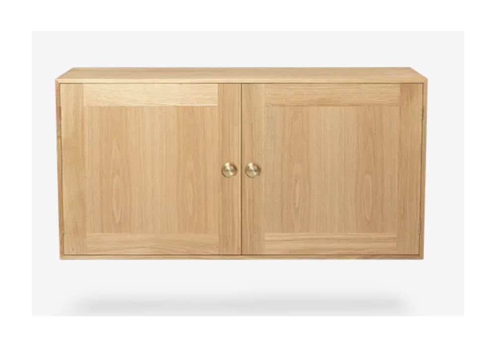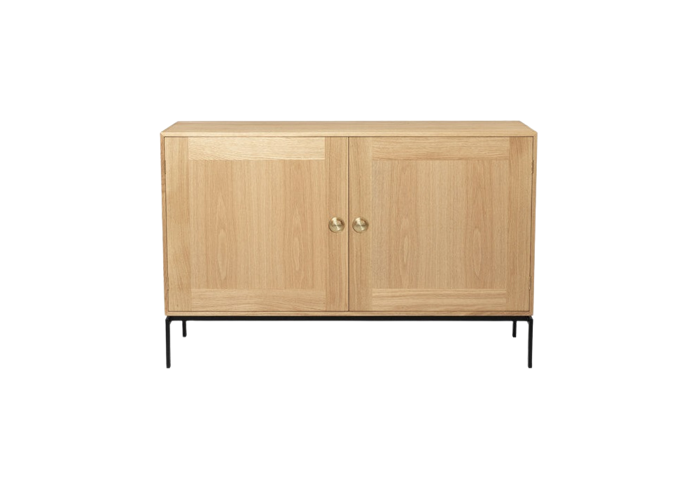 FK63 designed by Fabricius and Kastholm for Carl Hansen & Søn is a cabinet with structure, doors and bottom in oak veneer. Handles and hinges in brass. The base is in black painted steel.