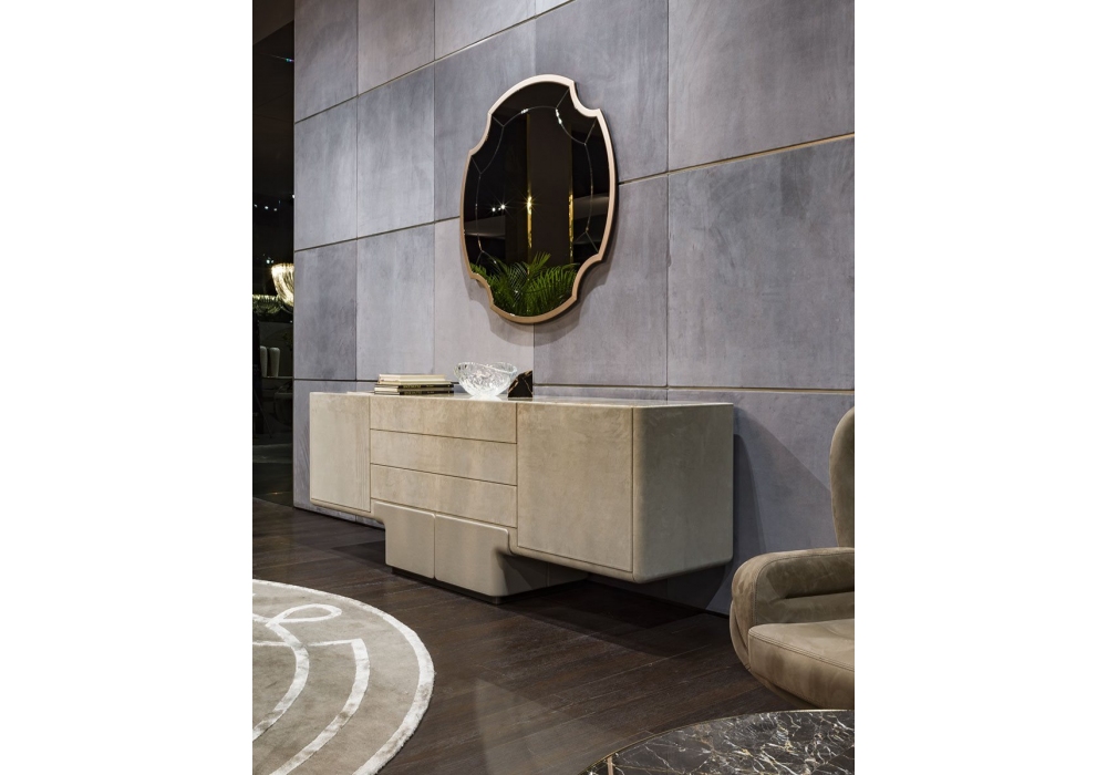 Do designed by Ben Wu for Longhi is a cabinet with ground metal base, structure in MDF covered in leather and top in mirror, marble or wood veneer. Available in the low version, with two flap doors and two drawers, or in the high version with two doors and 3 drawers.