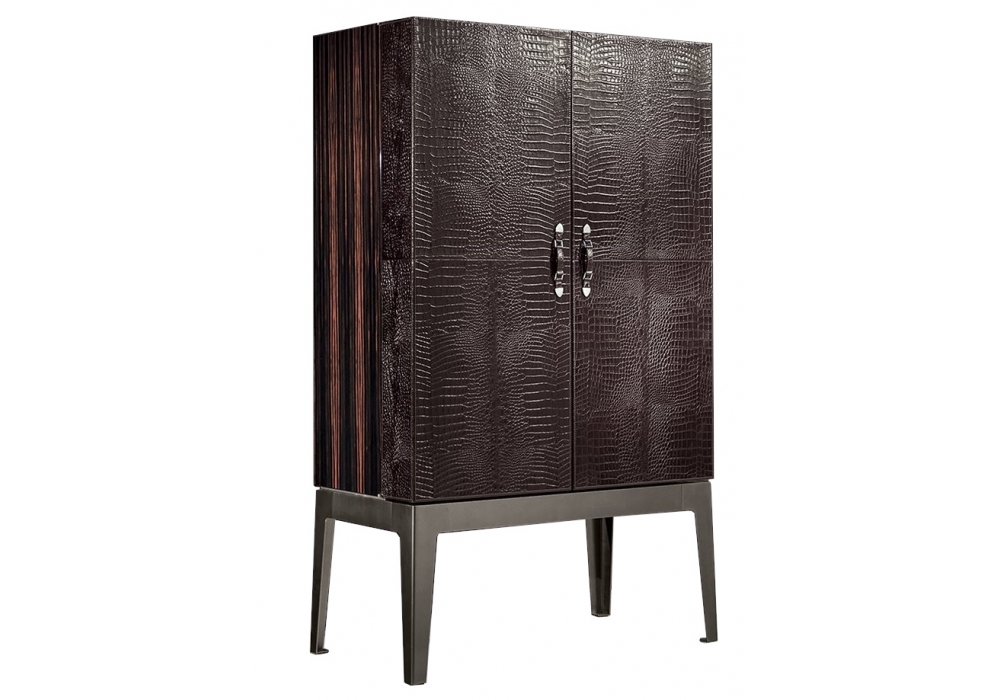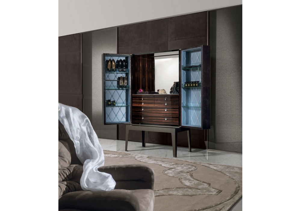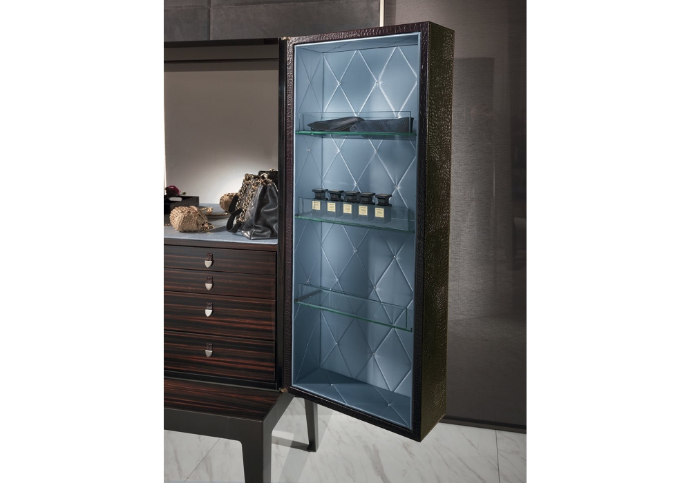 Grandeur Evo designed by Giuseppe ViganĂ² for longhi is a high cabinet with doors covered in leather, base in ground metal and structure in veneered or glossy lacquered wood. Interior lined in satin or diamond quilted velvet with Swarovski buttons. Transparent glass shelves and leather handles. Central cabinet with chest of drawers with 6 drawers with velvet bottom. Open compartment with mirror bottom illuminated with LED light.