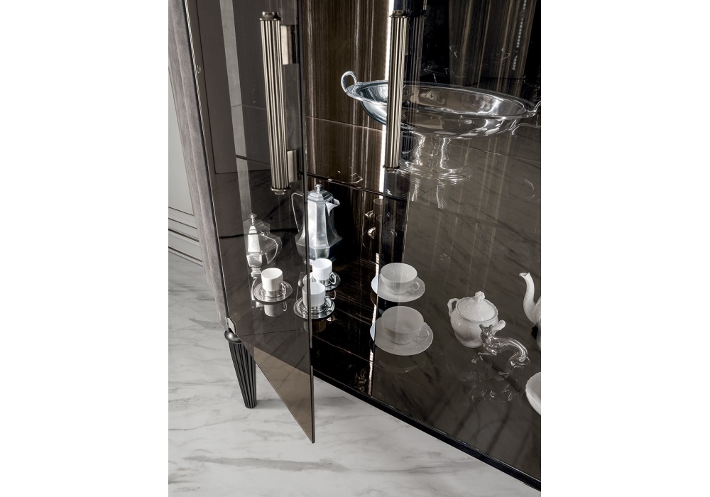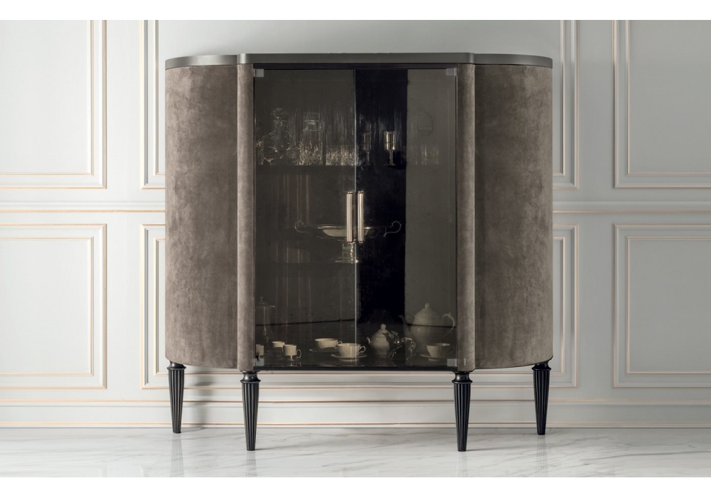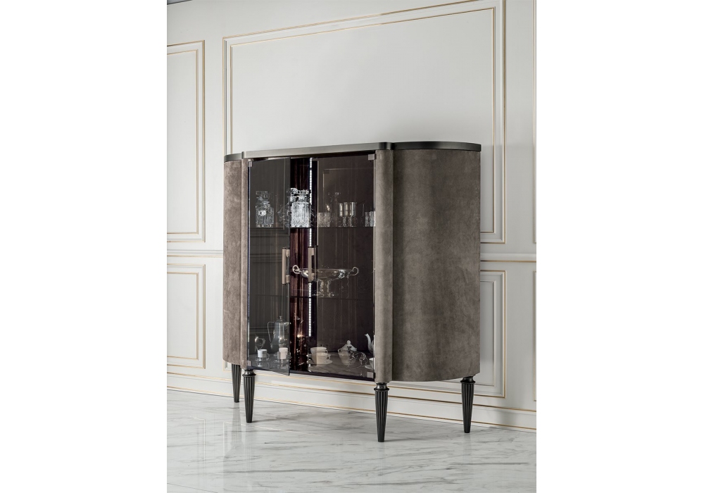 Kate designed by Giuseppe Iasparra for longhi is a high cabinet with internal structure and top in veneered wood. Curved sides covered in leather, and doors in bronze or smoked StopSol tempered glass. Grooved metal handles and metal parts in glossy or matte finish.