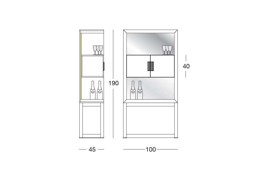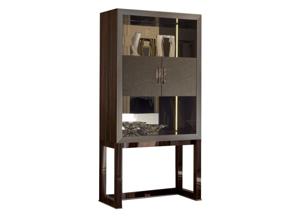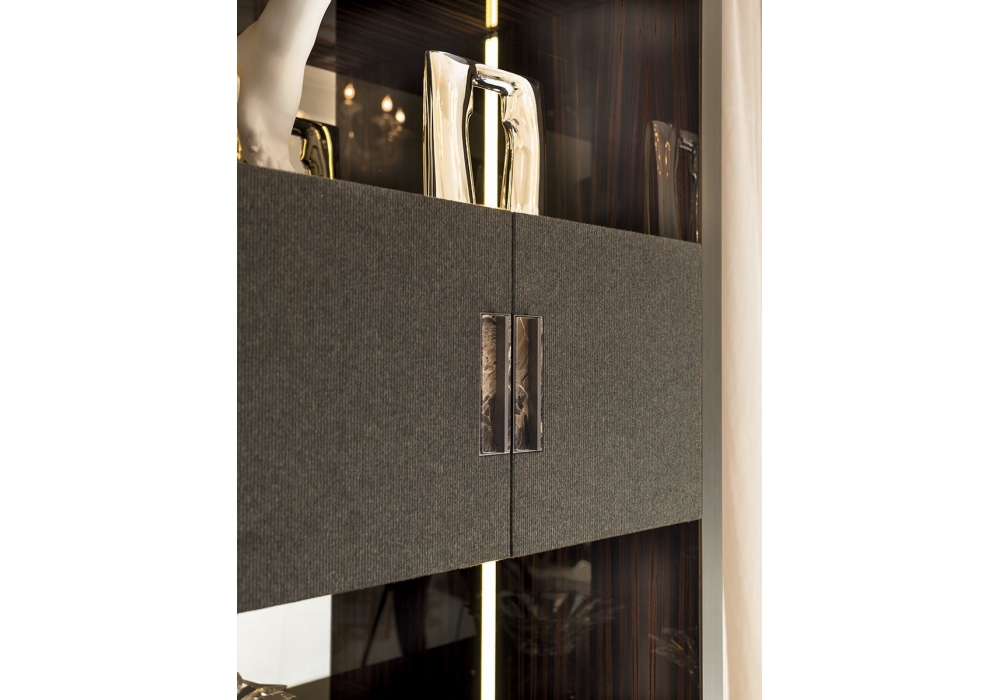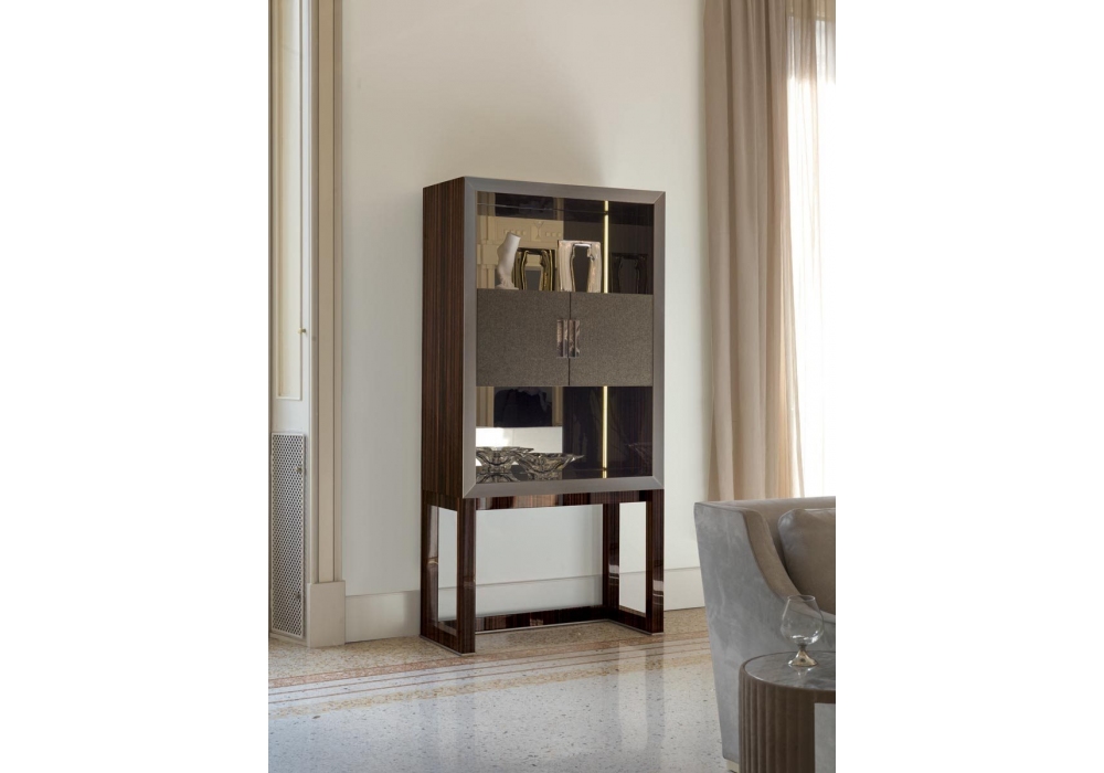 Orwell Designed by Giuseppe ViganĂ² for Longhi is a high cabinet with base and frame in ground metal, structure in veneered or glossy lacquered wood and central door upholstered in leather or cashmere. Marble handle. On the sides of the backrest there are two dimmable LED strips with touch-sensitive ignition, which illuminate the inside of the piece of furniture.
