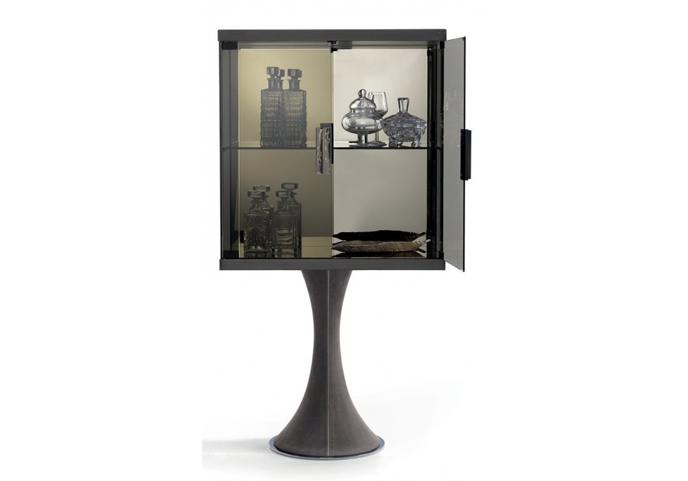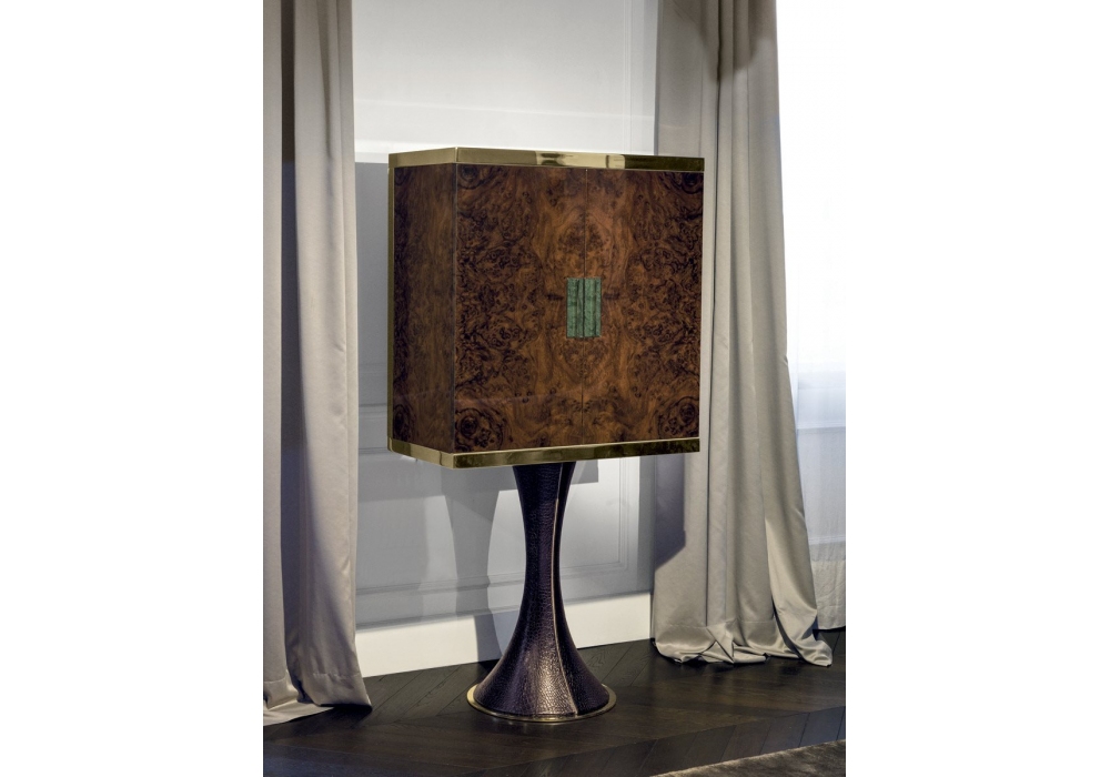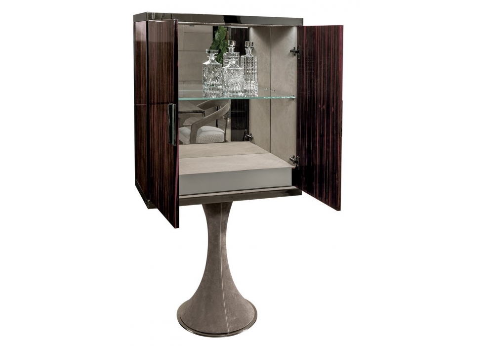 Oscar designed by Giuseppe ViganĂ² for Longhi is a high cabinet with hyperboloid column in fiberglass with internal structure in painted metal and external covering in leather. Metal parts in glossy or matt finish and structure in bronze or smoked glass or wood essence. Metal handle with marble insert. Lighting via dimmable LED strips with touch-sensitive ignition. On request is avaible the version with wooden structure and leather-covered doors.