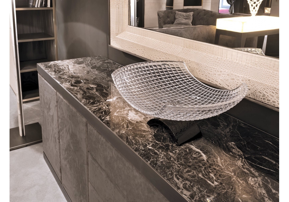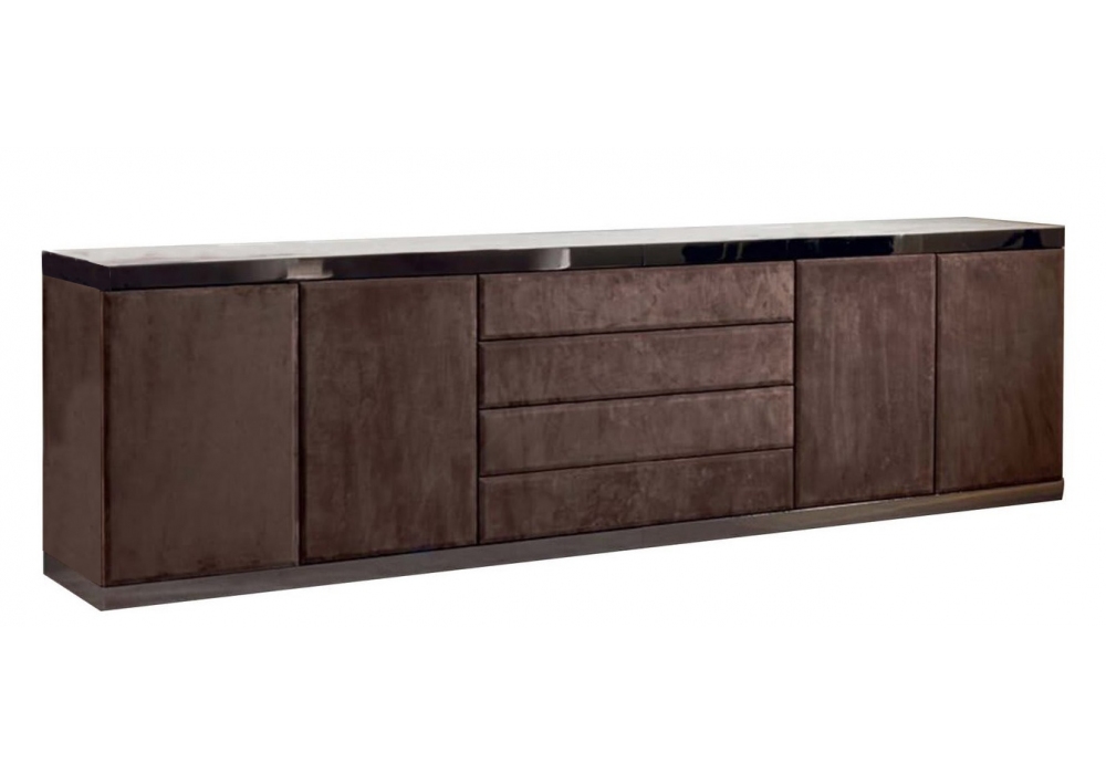 Baku designed by Giuseppe ViganĂ² for Longhi is a cabinet with metal parts (base and undertop edge) in ground metal, structure covered in leather with top in marble, wood veneer or mirror. On request it is available in the version with wooden sides and fronts covered or entirely in wood essence.