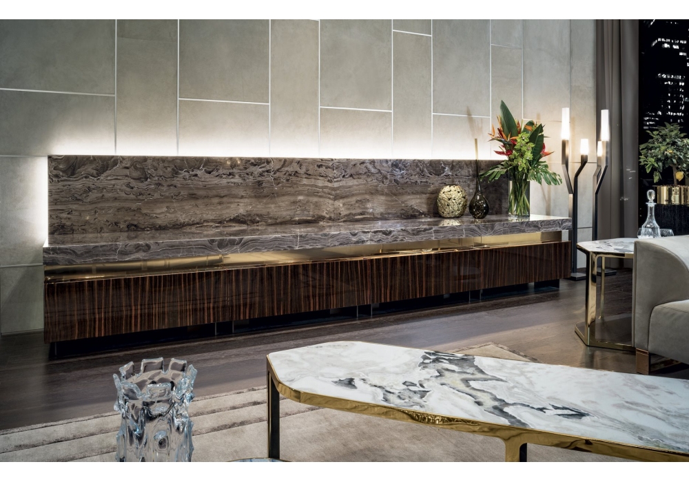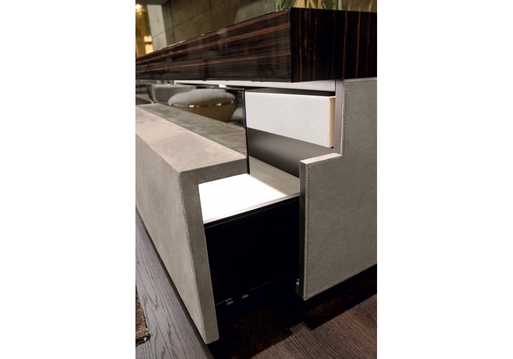 Terrance designed by Giuseppe ViganĂ² for Longhi is a cabinet with legs in bronze painted metal, upper drawers in veneered wood, glossy lacquered or in leather. Push-pull openings and internal groove of the drawer in ground metal in different finishes. Dimmable LED internal groove lighting with touch switch. Bronze painted interior and chest of drawers in leather. Top in marble or wood. Available in the version with or without marble backrest with LED lighting. The effect is a beam of light that illuminates the wall.