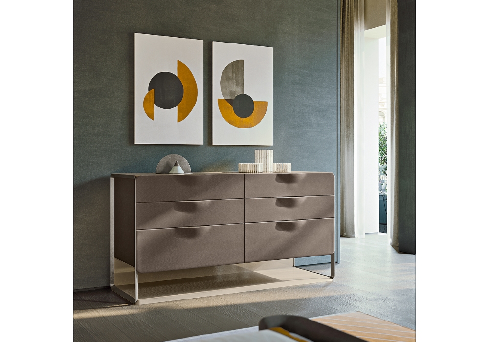 Milano designed by Blengini Ghirardelli for Turri is a chest of drawers with structure in MDF and plywood covered in different leathers. The top is made of wood in a glossy lacquered finish. There are six drawers with microfibre lining.