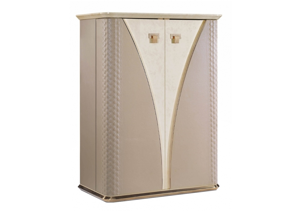 Vogue designed by Andrea Bonini for Turri is a cabinet with structure in MDF, plywood and particle board panels in glossy lacquered finish and upholstery in different leathers. The doors are externally covered in leather embroidered with a hexagon, and in smooth leather internally. There are three shelves in glossy lacquered wood. Handles and decorative details in golden metal.