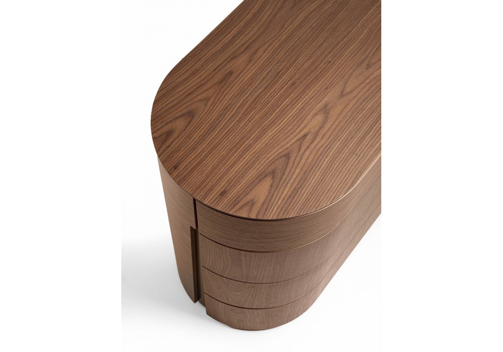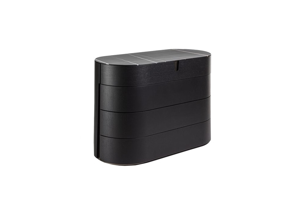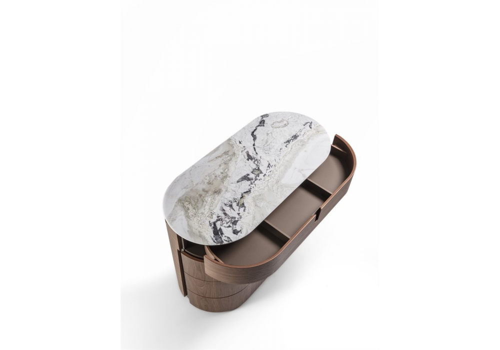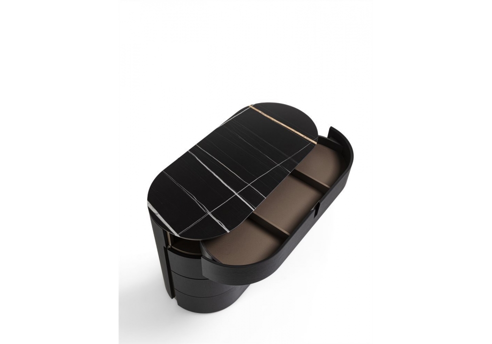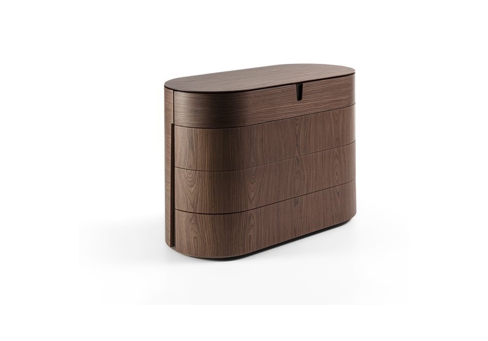 Tylsa Night 4 designed by D. Radice for Porada is a chest of drawers with four drawers with structure in ash or canaletta walnut. Metal base in Bronzoro finish and top in wood or marble. Upper drawer handle recessed with metal bottom in Bronzoro finish. Upper drawer divided into three compartments and lower drawers with push-pull opening. Interior of the drawers in scratch-resistant titanium finish.