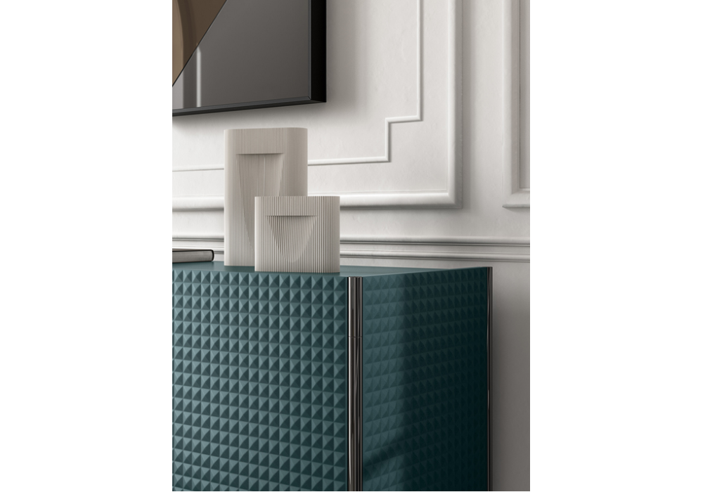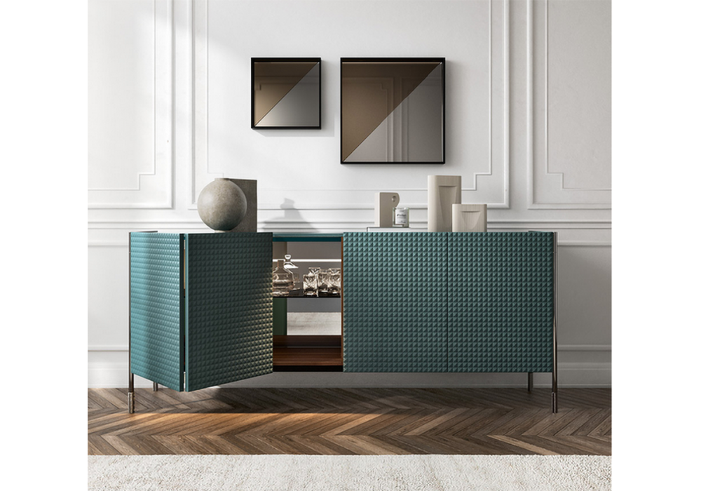 Spin designed by Alessio Bassan & Silvano Pierdonà for Capodopera is a cabinet with external sides and fronts in aluminum honeycomb covered in MDF. The legs are in black nickel metal and are equipped with knurled adjustable feet. There are 4 sliding doors with 2 internal compartments and 2 movable shelves in gray glass. The inside of the cabinet can be chosen from different matt lacquered finishes or in Canaletto walnut with a gray mirror back.
