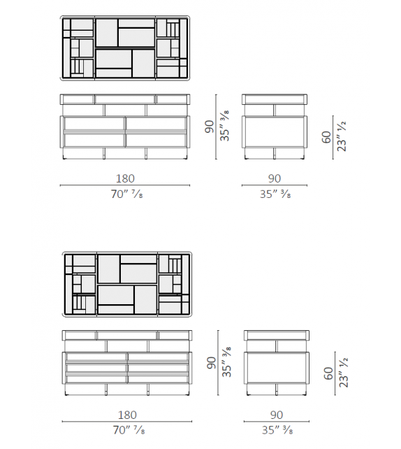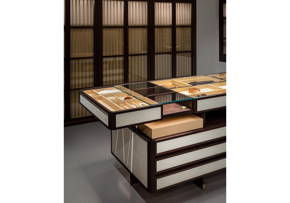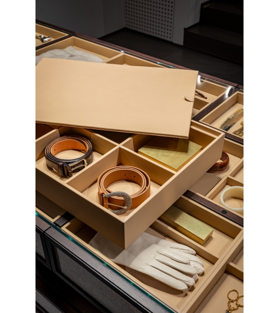 Full Island designed by Roberto Lazzeroni for Ceccotti Collezoni is a free-standing chest of drawers with a solid walnut structure and front and side panels covered in fabric, leather, or lacquered in various finishes. Upper surface in extra-clear tempered glass. Full Island has several drawers and removable trays.