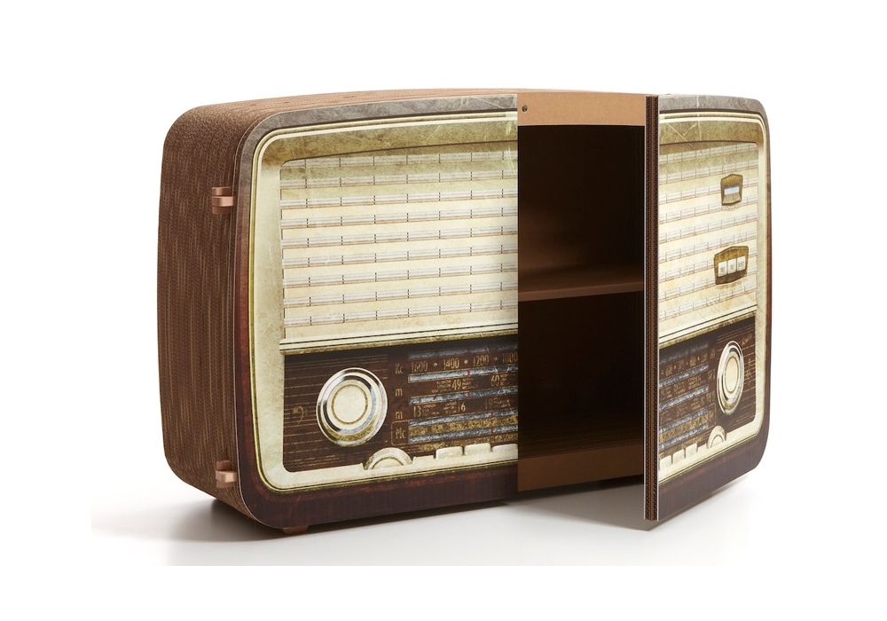 Aradio by Kubedesign is a 3d cardboard cabinet; 2 texturized shutters with adjustable hingles and magnetic lock. 1 cadboard shelf. Optional texturized back on demand. Regulable feet.