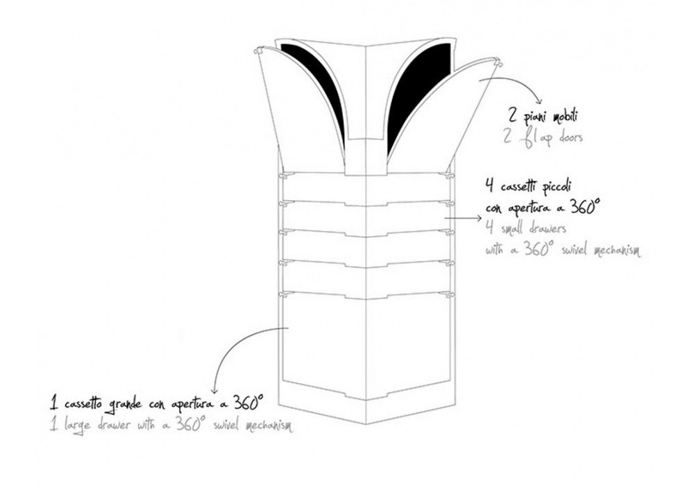 Nyn designed by Chi Wing Lo for Giorgetti is a corner chest of drawers with a maple frame. The upper side doors are drop-down. The lower section features one large drawer and four smaller ones, each with a 360° opening. Each drawer has an independent opening system with Arnite spacers.