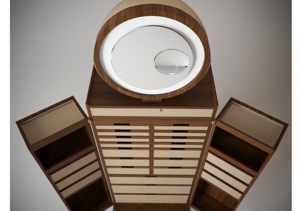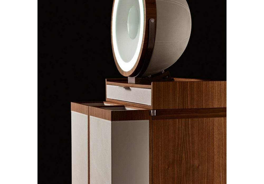 Oro designed by Chi Wing Lo for Giorgetti is a high chest of drawers in canaletto walnut and leather inserts, with drawers of three different sizes and two container doors with internal drawers and a secretary. Oro is available in the version without or with circular mirror, with magnifying insert and adjustable angle. The metal parts and the base are in bronze painted metal.