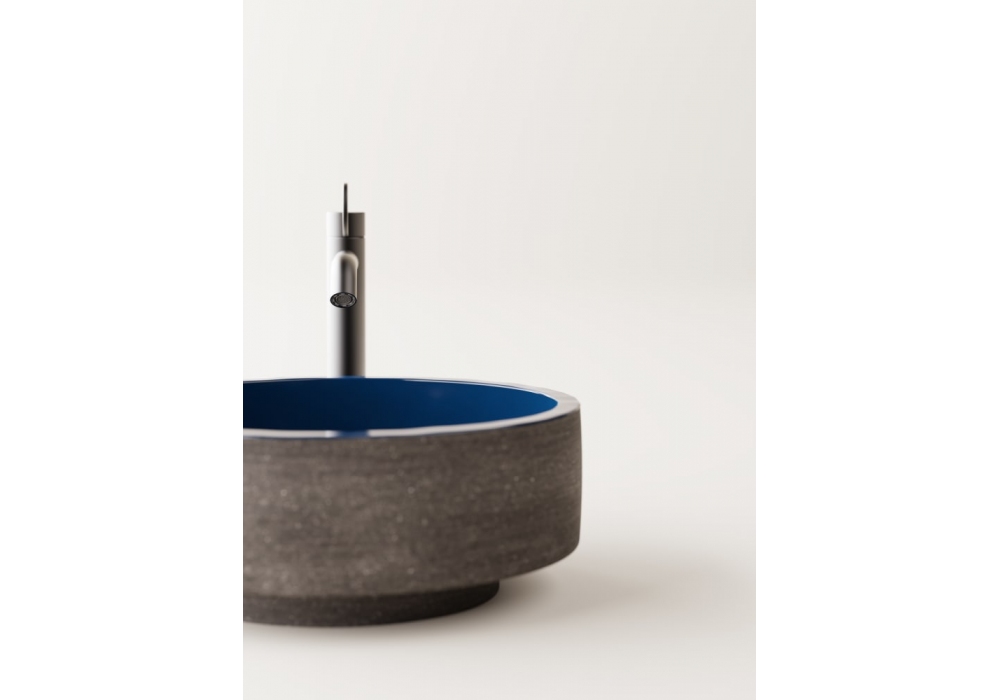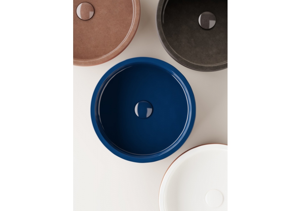 Cenote designed by Patricia Urquiola for Agape is a round countertop washbasin made of refractory clay. There is no tap hole. Free unloading. The external finish is available in natural earth or dark earth, both with a glossy enamelled interior. Drain with matching enamelled cap included.