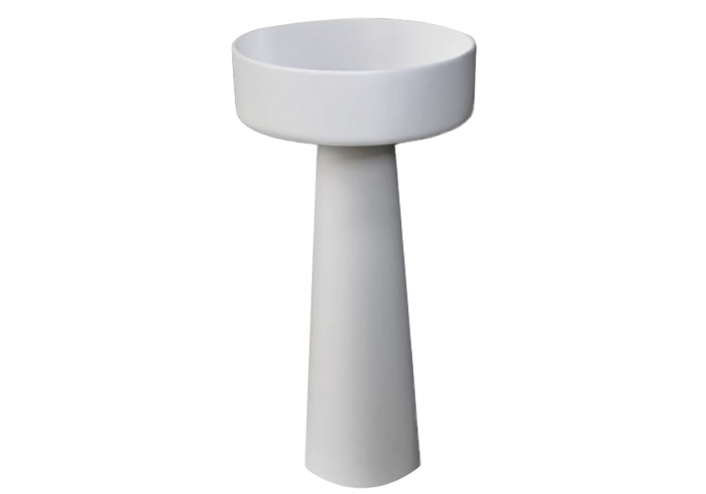 Bjhon 1 designed by Angelo Mangiarotti for Agape is a pedestal washbasin made of marble, biobased Cristalplant® or Cementobasic® in different finishes. It is characterized by a cylindrical basin and support on the ground. There is no hole for the tap, free drain. Available in the version with wall or floor drain.