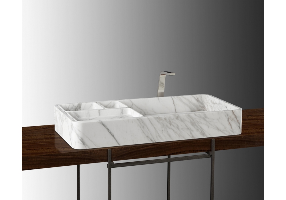 Bento designed by Matteo Nunziati for Kreoo is a rectangular washbasin with rounded corners and entirely made of marble. Inside the tub there are four container elements of various dimensions that can be removed and interchanged with each other; you can use them in direct contact with water or store your bathroom accessories. The exhaust is completely hidden by one of them.
